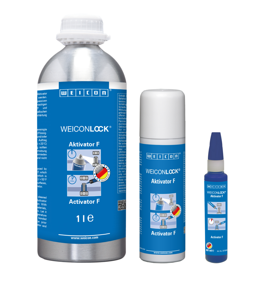 Met WEICON Aktivator F kan de uithardingstijd sterk worden verkort. De activator wordt ook geadviseerd bij alle passieve oppervlakken, evenals in elk geval bij lage omgevingstemperaturen (< +10 °C/+50 °F en daaronder) en grote naadbreedtes. Bij niet-metalen oppervlakken zorgt de activator pas voor uitharding van WEICONLOCK.