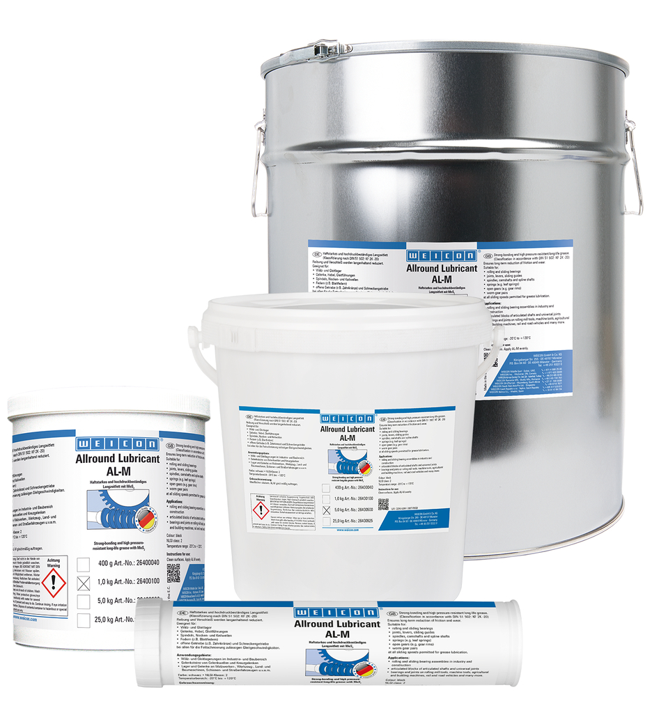 WEICON AL-M vermindert langdurig wrijving en slijtage en is geschikt voor wals- en glijlagers, scharnieren, hendels en lagers, voor spindels, nokken- en getande assen, veren, open aandrijvingen, wormwieloverbrengingen en bij alle voor vetsmering toegelaten glijsnelheden.