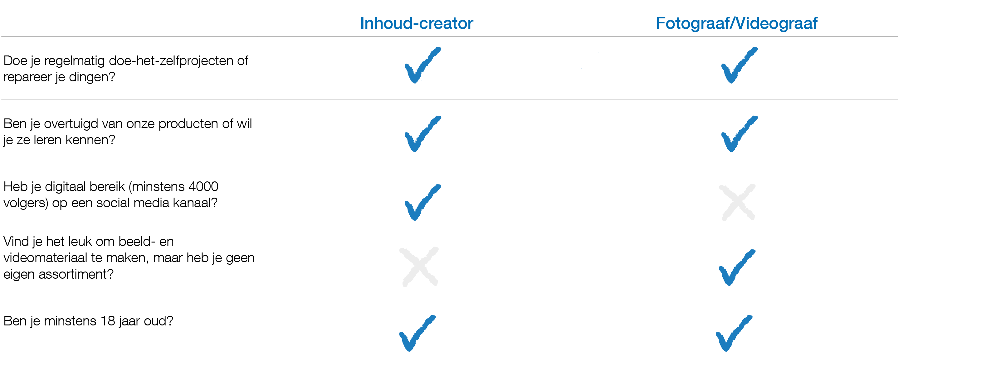 We zijn altijd op zoek naar samenwerkingspartners die onze producten in hun projecten gebruiken en deze presenteren of aantrekkelijke content creëren die wij kunnen gebruiken. Of het nu gaat om elektrische installatie, in de werkplaats, bij camperverbouwingen of in de tuin, we hebben zeker een product in ons portfolio dat je helpt om je project succesvol uit te voeren. Ontdek of je bij ons past als content creator of fotograaf/videograaf. Als je deel wilt uitmaken van ons creatieve team, vul dan onderstaand formulier in en wie weet maak jij binnenkort deel uit van ons team!