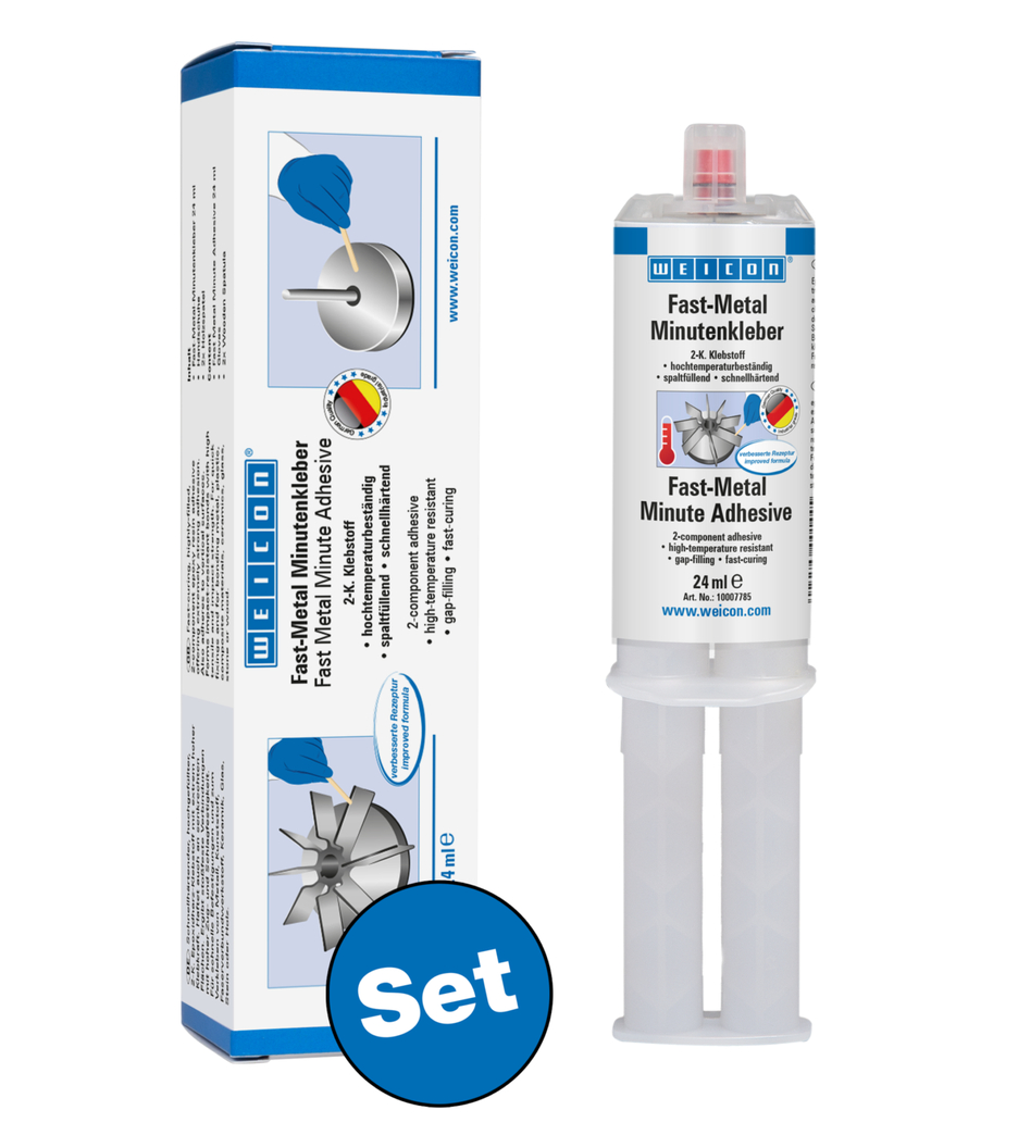 WEICON Fast-Metal minutenlijm is een 2-componenten epoxysysteem dat speciaal is ontwikkeld voor reparaties en verlijmingen waarbij grotere toleranties moeten worden overbrugd. Dankzij zijn spleetvullend vermogen is de lijm geschikt voor ruwe en slecht passende oppervlakken en vult hij scheuren, holtes en oneffenheden. WEICON Fast-Metal minutenlijm is hittebestendig tot +180 °C en heeft een extreem hoge kleefkracht, zelfs op verticale oppervlakken. Het systeem is hooggevuld, pasteus, heeft een zeer korte verwerkingstijd en hardt snel uit. Het maakt verbindingen mogelijk die bestand zijn tegen stootbelasting en die een hoge trek- en slagvastheid hebben. WEICON Fast-Metal minutenlijm kan op talrijke materialen, zoals metaal, kunststof, glasvezelmaterialen, keramiek, glas, steen of hout worden toegepast. De lijm kan worden gebruikt in veel industriële sectoren, voor ambachtelijke toepassingen en voor veeleisende DIY-projecten.
