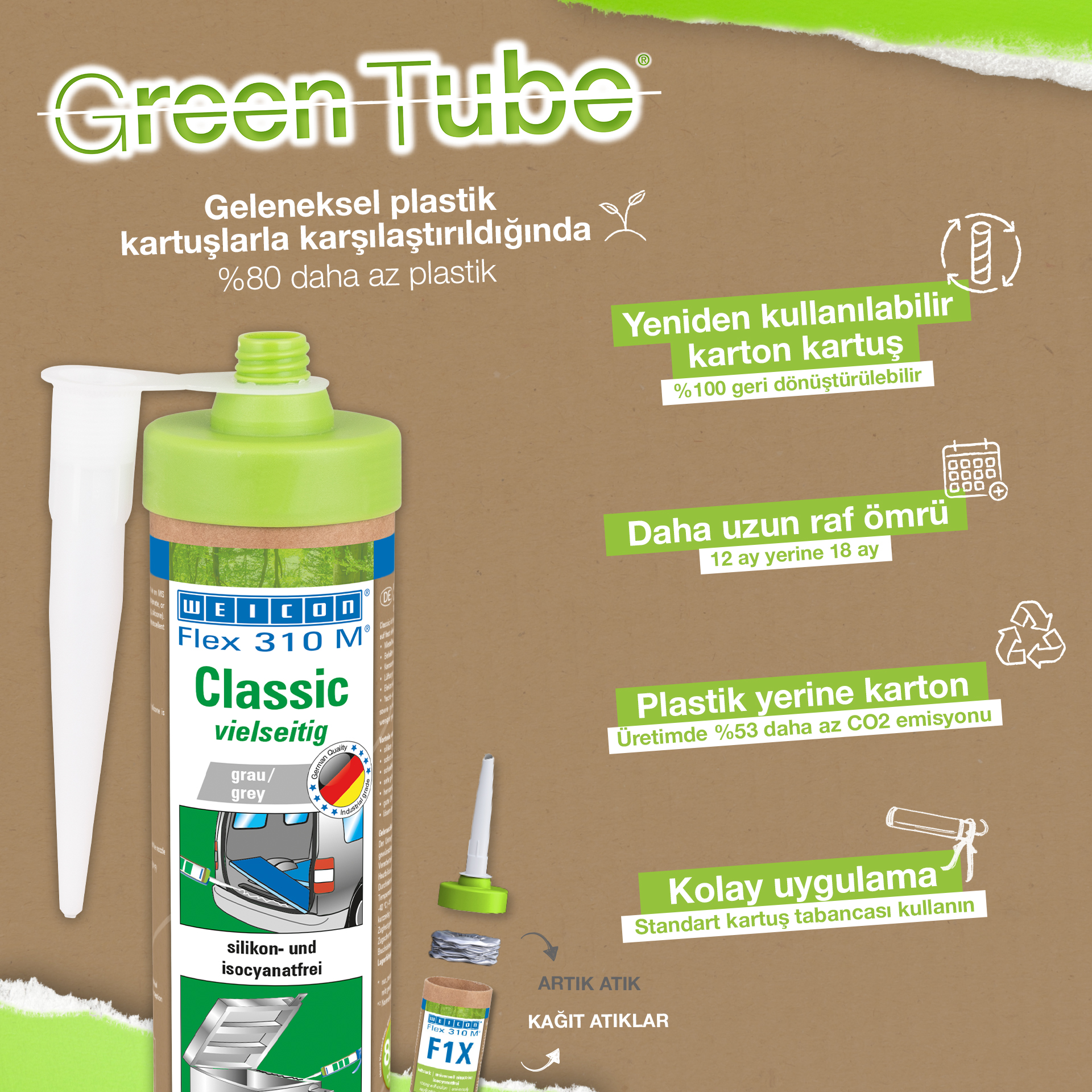 WEICON Flex 310M Classic heeft een sterke hechting, is “nat op nat” overschilderbaar, schuurbaar, heeft een uitstekende verouderingsbestendigheid en een goede UV-stabiliteit. Het is bestand tegen zoet- en zoutwater, en is vrij van siliconen, isocyanaten, halogenen en oplosmiddelen. Het product is ISEGA gecertificeerd und kan als lijm in de levensmiddelentechnologie worden gebruikt. Flex 310M Classic is een elastische lijm op MS-Polymeer basis en is geschikt voor verlijmingen van metalen, vele kunststoffen, keramiek, hout, glas en steen. Het lijm- en afdichtingsmiddel kan in de metaalbouw, in mediumhouder- en apparatenbouw, in carroserie-, voertuig- en containerbouw, in de ventilatie- en airconditioningtechniek, in de electro-industrie, in de jacht- en bootsbouw, en overal daar waar siliconen, danwel silicoonhoudende producten niet geschikt zijn, worden toegepast.