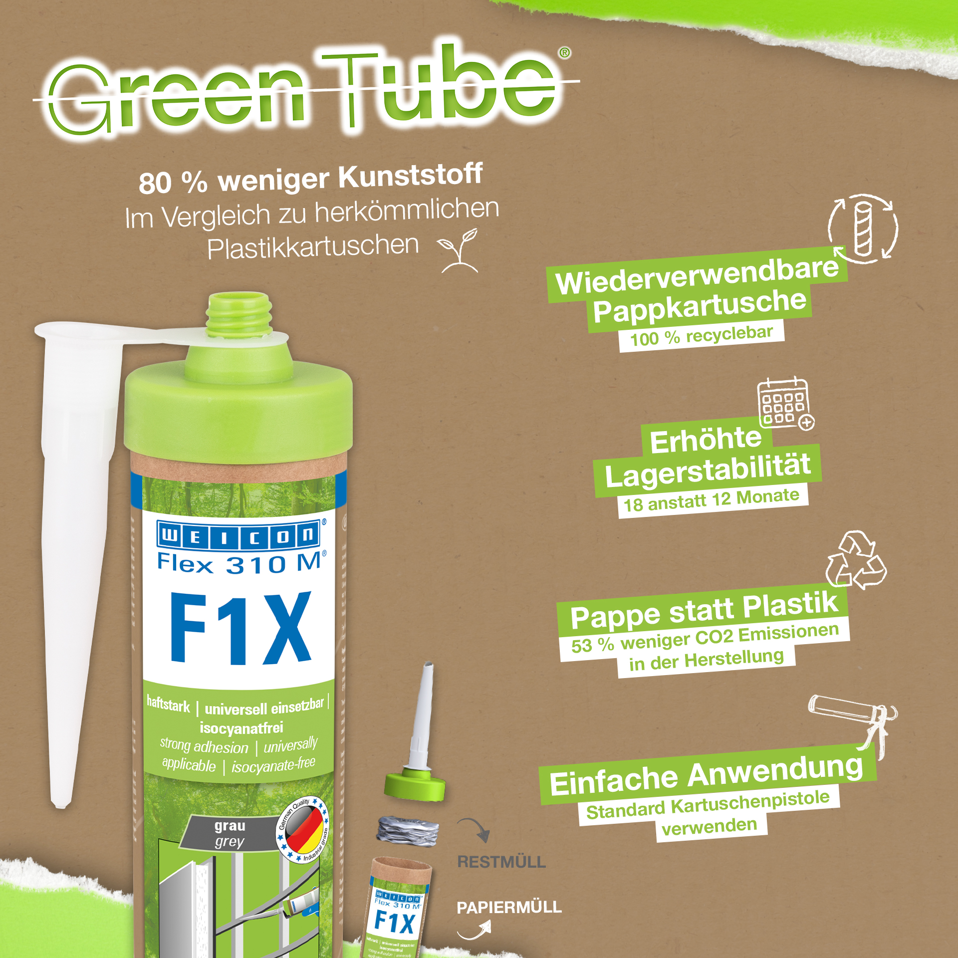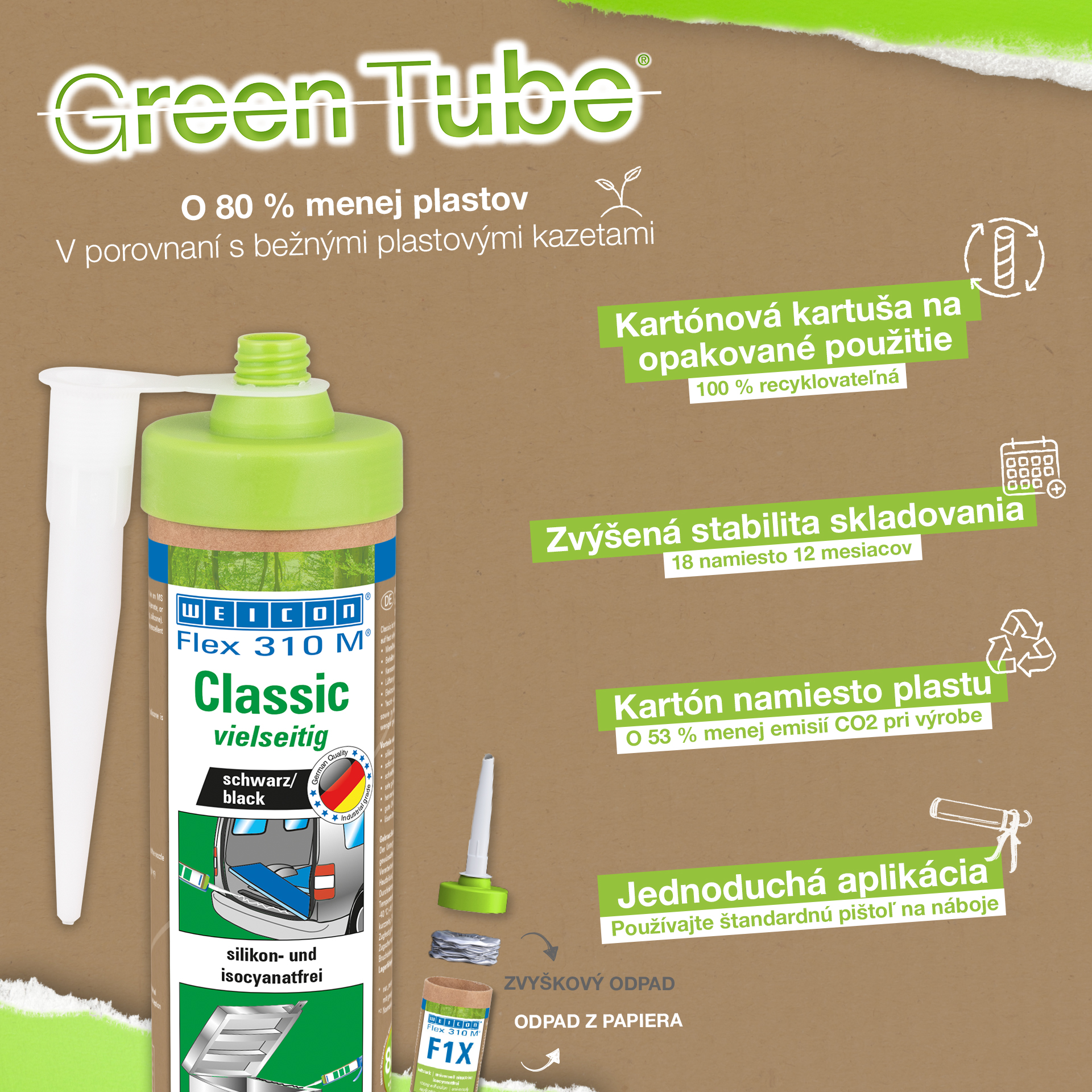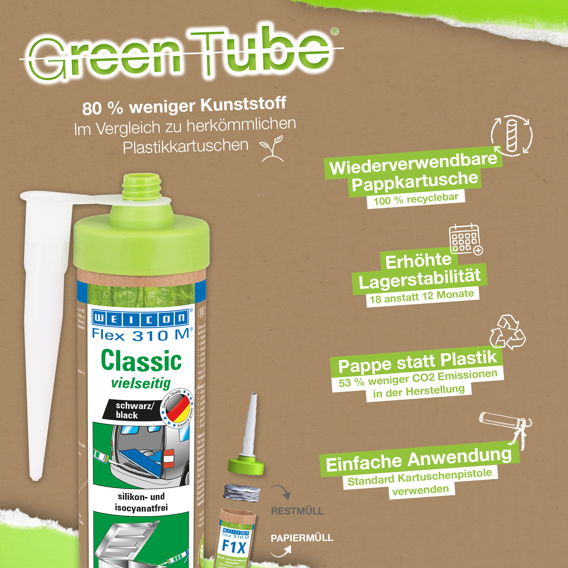 WEICON Flex 310M Classic heeft een sterke hechting, is “nat op nat” overschilderbaar, schuurbaar, heeft een uitstekende verouderingsbestendigheid en een goede UV-stabiliteit. Het is bestand tegen zoet- en zoutwater, en is vrij van siliconen, isocyanaten, halogenen en oplosmiddelen. Het product is ISEGA gecertificeerd und kan als lijm in de levensmiddelentechnologie worden gebruikt. Flex 310M Classic is een elastische lijm op MS-Polymeer basis en is geschikt voor verlijmingen van metalen, vele kunststoffen, keramiek, hout, glas en steen. Het lijm- en afdichtingsmiddel kan in de metaalbouw, in mediumhouder- en apparatenbouw, in carroserie-, voertuig- en containerbouw, in de ventilatie- en airconditioningtechniek, in de electro-industrie, in de jacht- en bootsbouw, en overal daar waar siliconen, danwel silicoonhoudende producten niet geschikt zijn, worden toegepast.