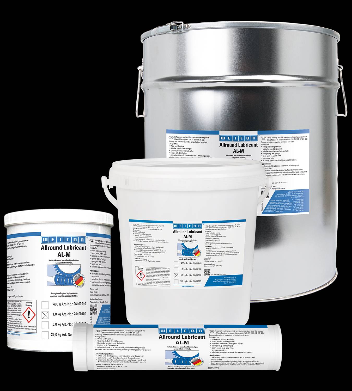 WEICON AL-M réduit la friction et l'usure en longue durée et convient pour des paliers à rouleaux et à glissement, articulations, leviers, glissières, broches, arbres à cames et cannelés, ressorts, engrenages nus, vis sans fin et ce à toutes les vitesses de glissement autorisées pour la lubrification à la graisse.