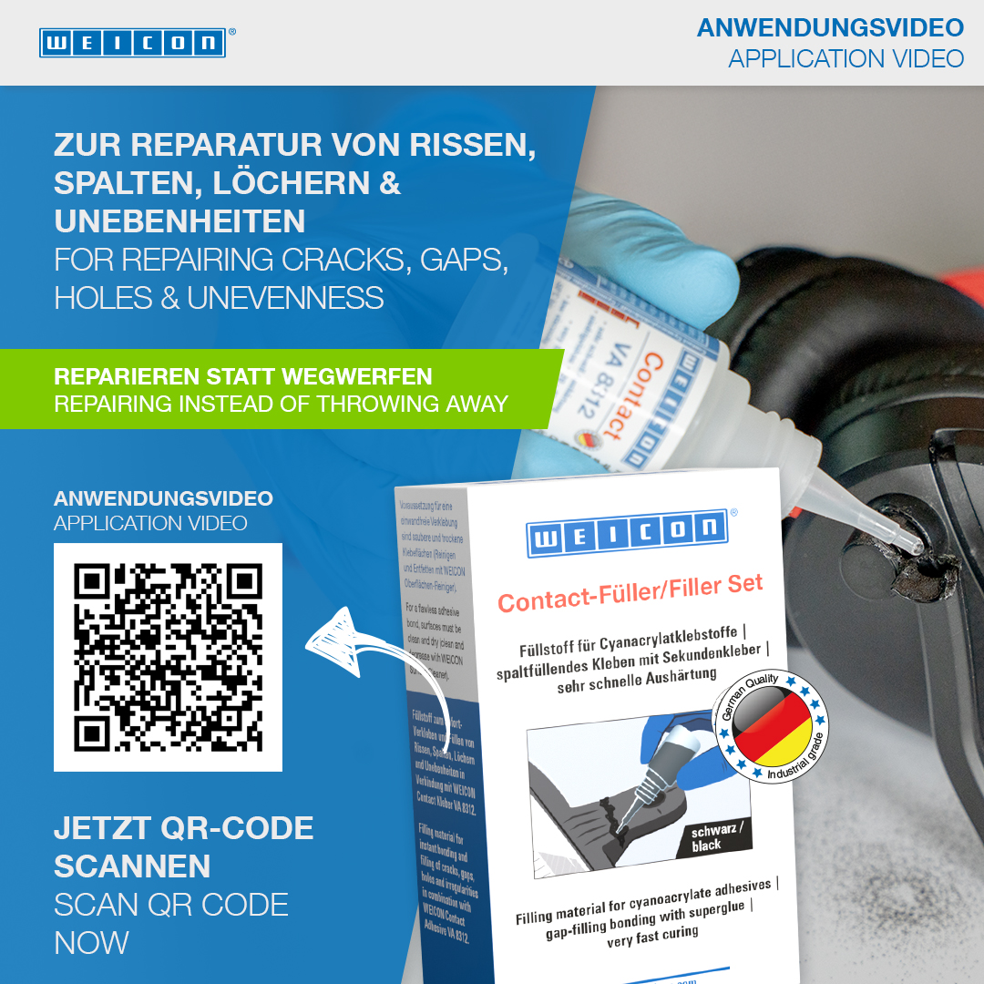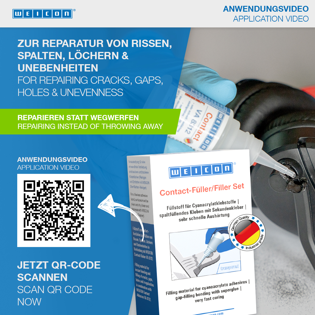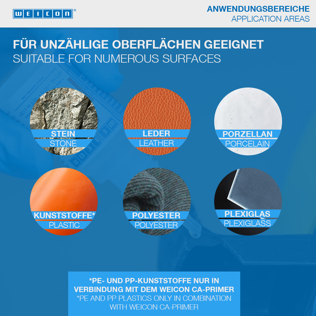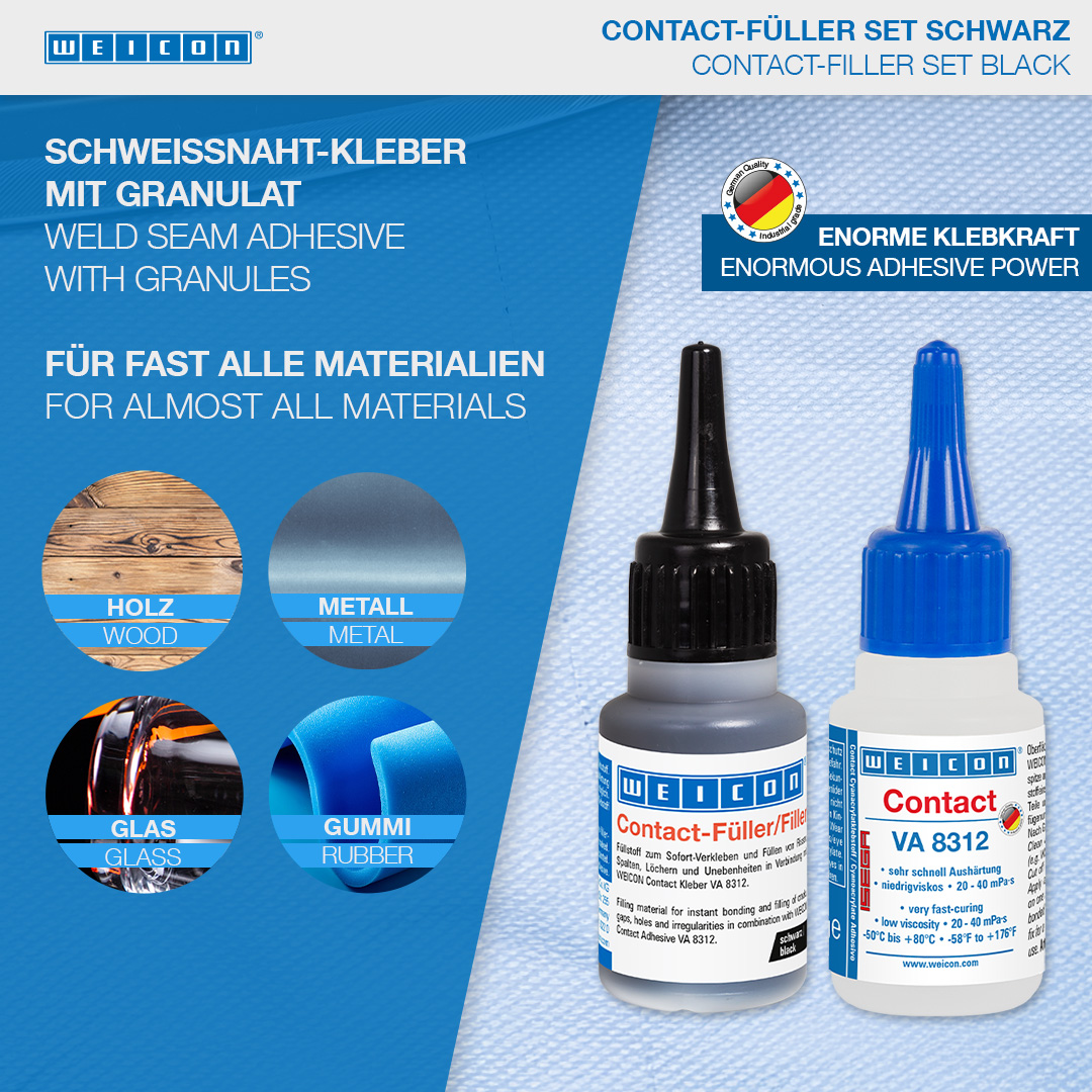 WEICON Contact VA 8312 convient pour coller différents matériaux en caoutchouc, comme le caoutchouc plein ou le caoutchouc mousse, les matières plastiques et les élastomères EPDM. En combinaison avec WEICON CA-Primaire, VA 8312 convient aussi aux polyoléfines (PE-polyéthylène, PP-Polypropylène). VA 8312 convient également en combinaison avec WEICON Contact Filler pour le collage instantané et le remplissage de fissures, fentes, trous et inégalités.