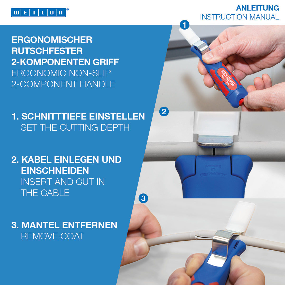 Grand diamètre du manche pour bien tenir en main Vis de réglage en continu facile à utiliser Dégainage précis, rapide et sûr Remplacement rapide de la lame intérieure grâce à une fermeture à baïonnette