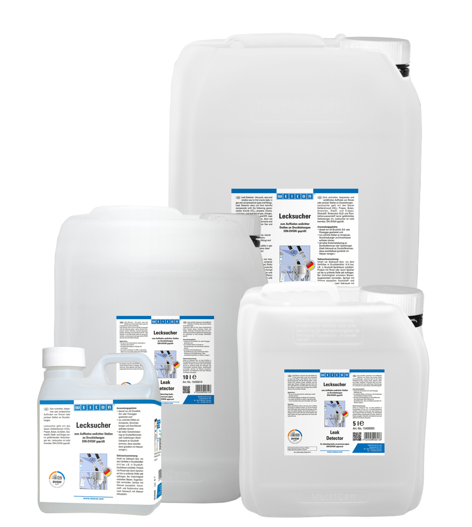 WEICON Détecte-Fuites sert à trouver rapidement, commodément et fiablement les inétanchéités (fentes ou porosités) sur les conduites sous pression. Le Détecte-Fuites ne se combine pas aux gaz tels que le dioxyde de carbone (CO2), le propane le butane, l’acétylène, l'oxygène, le gaz de ville et le gaz naturel. Il s'utilise partout où l'on travaille avec de l'air comprimé, du gaz naturel ou liquide, où des inétanchéités peuvent se produire sur la robinetterie, les raccords vissés et les connexions et comme forte contribution à la sécurité sur des freins pneumatiques et des conduites de gaz.