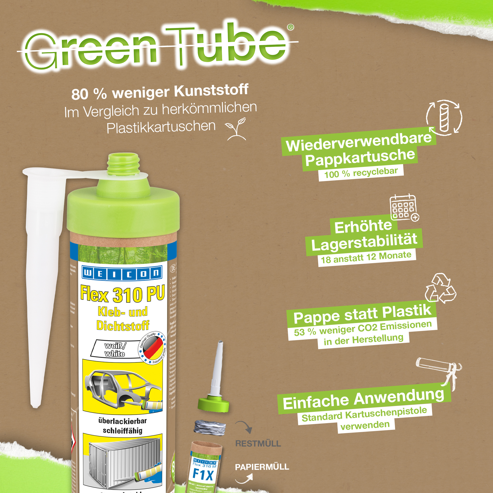 Le scellant adhésif WEICON Flex 310 M Acier Inox est non-corrosif, fortement adhésif, peut être peint «mouillé sur mouillé», il est ponçable et résistant au vieillissement et aux UV et est exempt de silicones, d'isocyanates, d'halogènes et de solvants. Le produit est certifié ISEGA et s'utilise comme adhésif en technologie alimentaire. Cet adhésif élastique à base de polymère MS convient pour coller et étancher des joints sur les métaux tels que l'acier inoxydable, l’aluminium et les métaux non-ferreux. Il s'utilise en outre partout où la couleur du scellant adhésif doit s'adapter au matériau (p.ex. acier inoxydable, aluminium, etc.) WEICON Flex 310 M Acier Inox s'utilise dans la construction métallique, la chaudronnerie, la construction d'appareils, l'industrie alimentaire, l'agencement de cuisines et le secteur sanitaire, la ventilation et la climatisation et partout où des silicones ou des produits siliconés ne conviennent pas.
