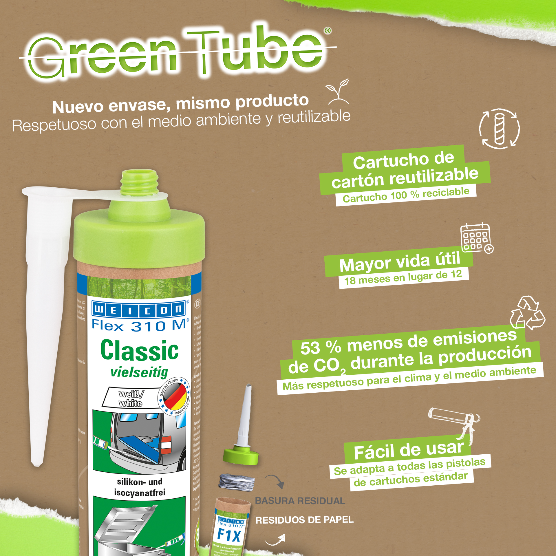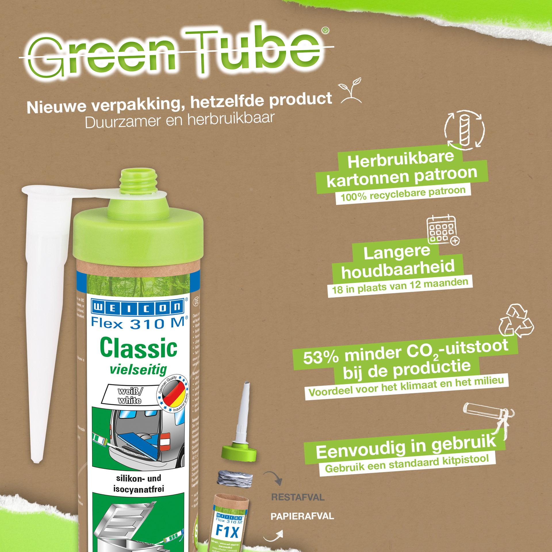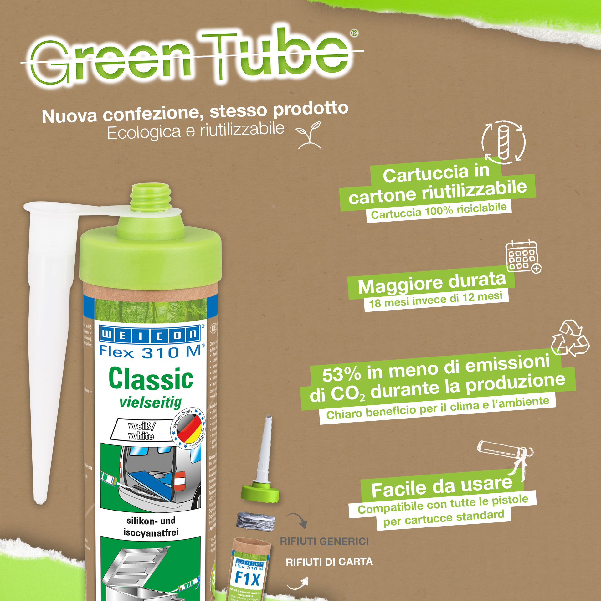 WEICON Flex 310 M Classic est fortement adhésif, peut être peint «mouillé sur mouillé». Il peut être poncé, il possède une excellente résistance au vieillissement et une bonne stabilité aux UV. Il est résistant à l'eau douce ou salée, exempt de silicone, d'isocyanate, d'halogènes et de solvants. Le produit est certifié ISEGA et s'utilise comme adhésif en technologie alimentaire. Flex 310 M Classic est un adhésif élastique à base de polymères MS qui convient pour assembler des métaux, de nombreuses matières plastiques, la céramique, le bois, le verre et la pierre. Le scellant adhésif s'utilise dans la construction métallique, la chaudronnerie, la construction d'appareils, en carrosserie, dans la construction de véhicules et de containers, dans la ventilation et la climatisation, dans l'industrie électrique, dans la construction de yachts et de bateaux et partout où des silicones ou des produits contenant des silicones ne conviennent pas.