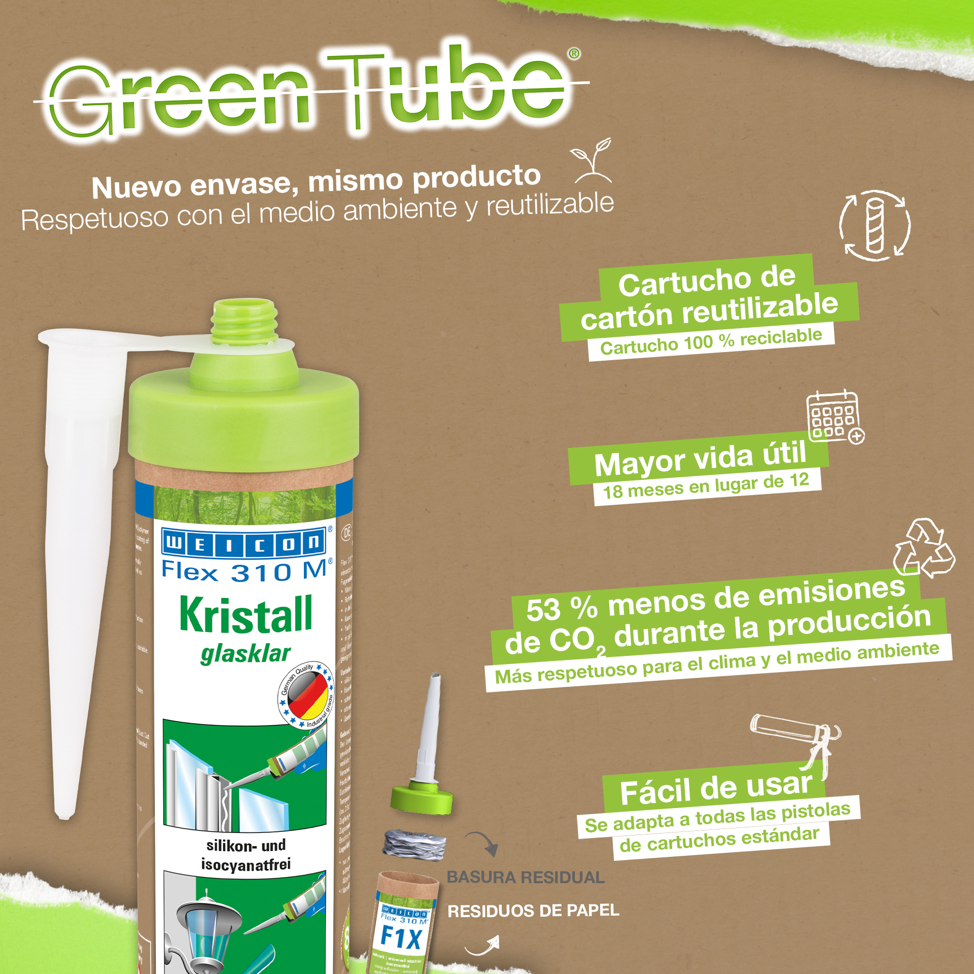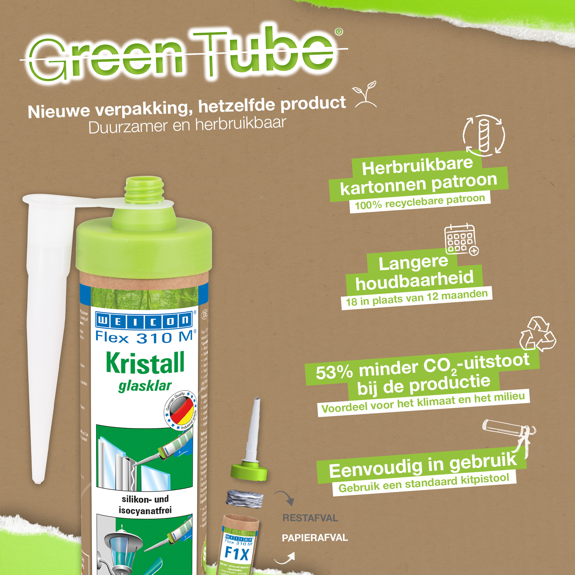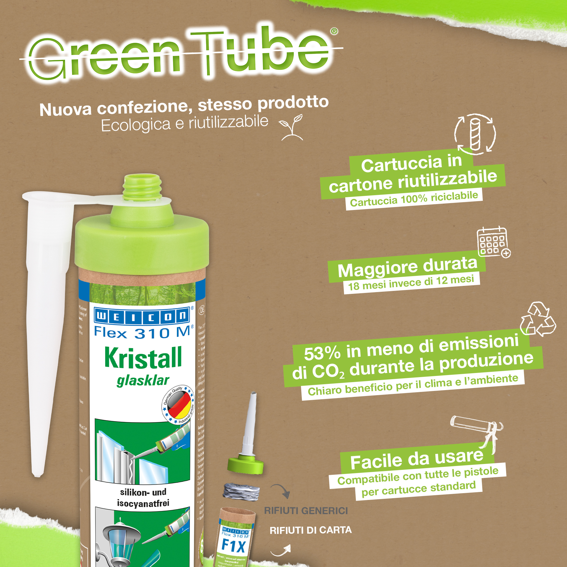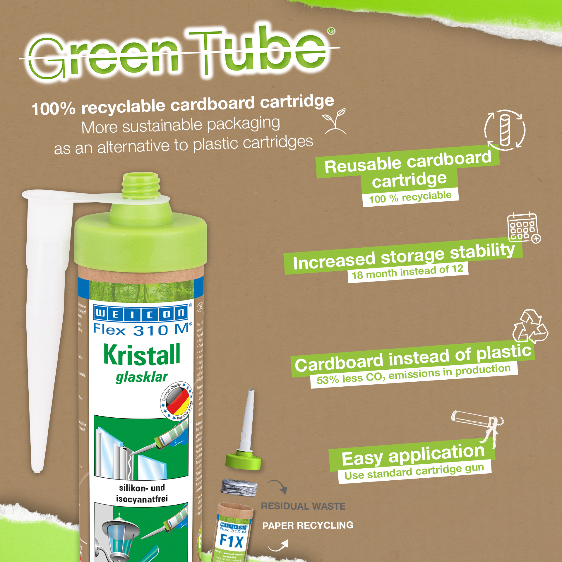 WEICON Flex 310 M Cristal est transparent, fortement adhésif, peut être peint «mouillé sur mouillé» et poncé. Il possède une excellente résistance au vieillissement, une bonne stabilité aux UV, il est résistant à l'eau douce et à l'eau salée, exempt de silicone, d'isocyanate, d'halogènes et de solvants. Il est certifié ISEGA et s'utilise comme adhésif en technologie alimentaire. Flex 310 M Cristal est un adhésif élastique à base de Polymères MS et convient pour assembler le verre, le PC*, le PMMA* et le verre acrylique*, les métaux, de nombreuses matières plastiques, la céramique, le bois et la pierre. Une fois durci, le produit est limpide et convient particulièrement pour les assemblages élastiques où l'adhésif peut ou doit rester invisible. Il s'utilise dans la transformation des matières plastiques, la construction métallique, la chaudronnerie, la construction d'appareils, la ventilation et la climatisation, l'industrie électrique et des luminaires, la construction de stands d'exposition et l'agencement de magasins et partout où les silicones ou les produits siliconés sont inappropriés. (* = Coller seulement sans tension)