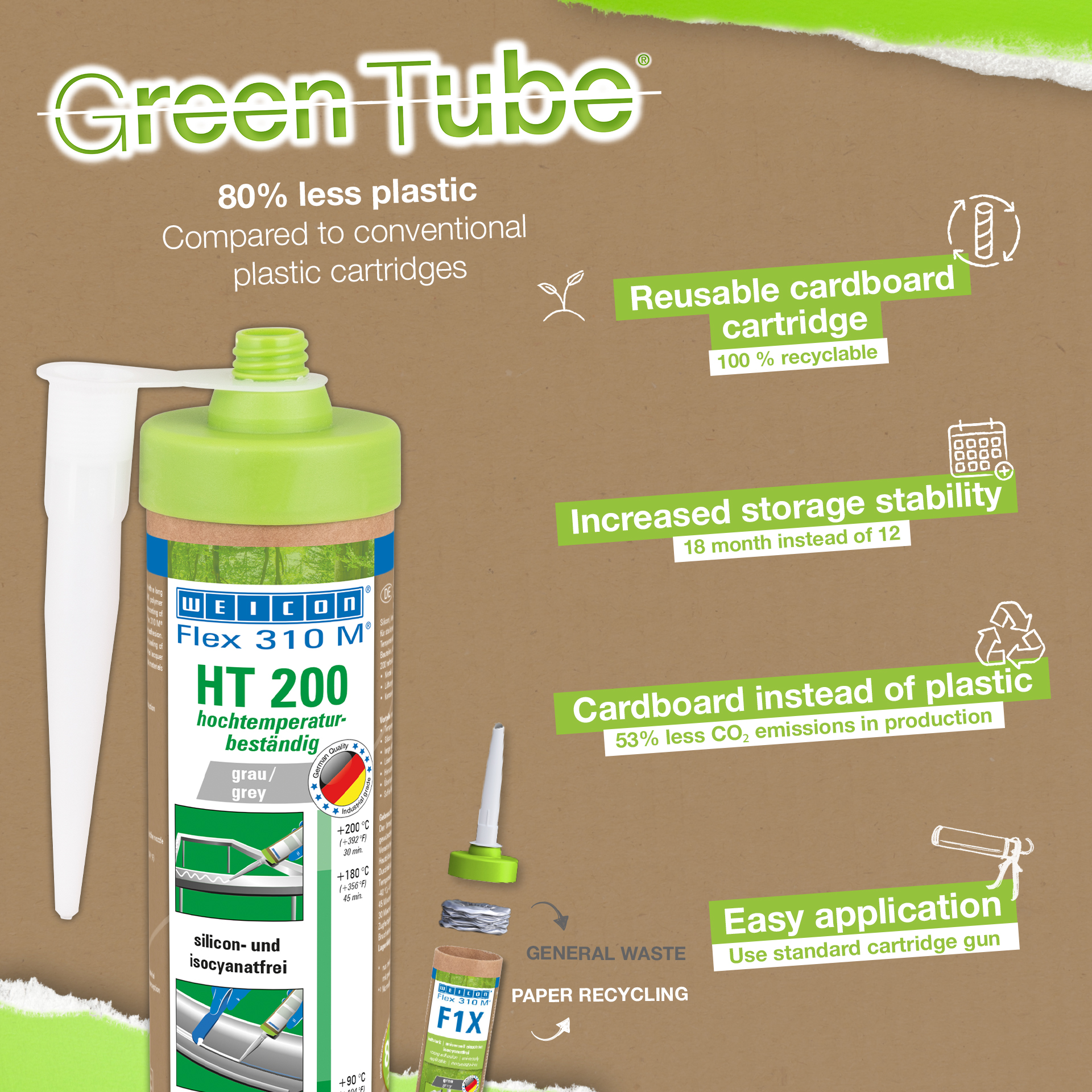 La haute résistance à la température permet de coller et d'étancher des éléments de construction qui doivent ensuite être thermolaqués (revêtus de poudre). WEICON Flex 310 M HT 200 peut être utilisé dans la construction métallique, la construction de réservoirs et d'appareils, la technique de ventilation et de climatisation, la construction de carrosseries, de conteneurs, de wagons et de véhicules. Flex 310 M HT 200 répond aux exigences pour les véhicules ferroviaires grâce au test selon DIN EN 45545-2 R1, R7, R17 HL3. WEICON Flex 310 M HT 200 est résistant aux températures élevées, possède une excellente résistance au vieillissement et est exempt de silicone, d'isocyanate, d'halogène et de solvant.