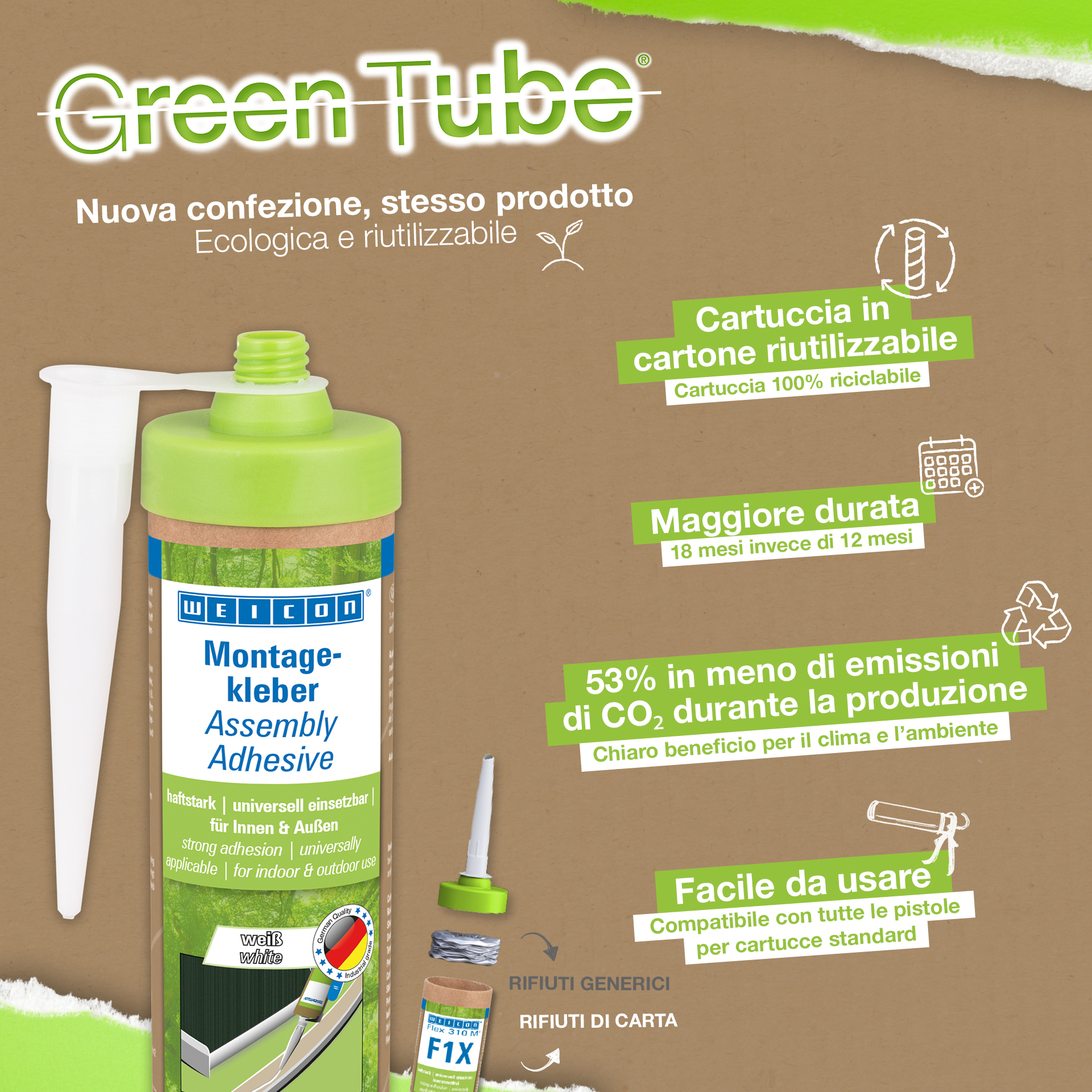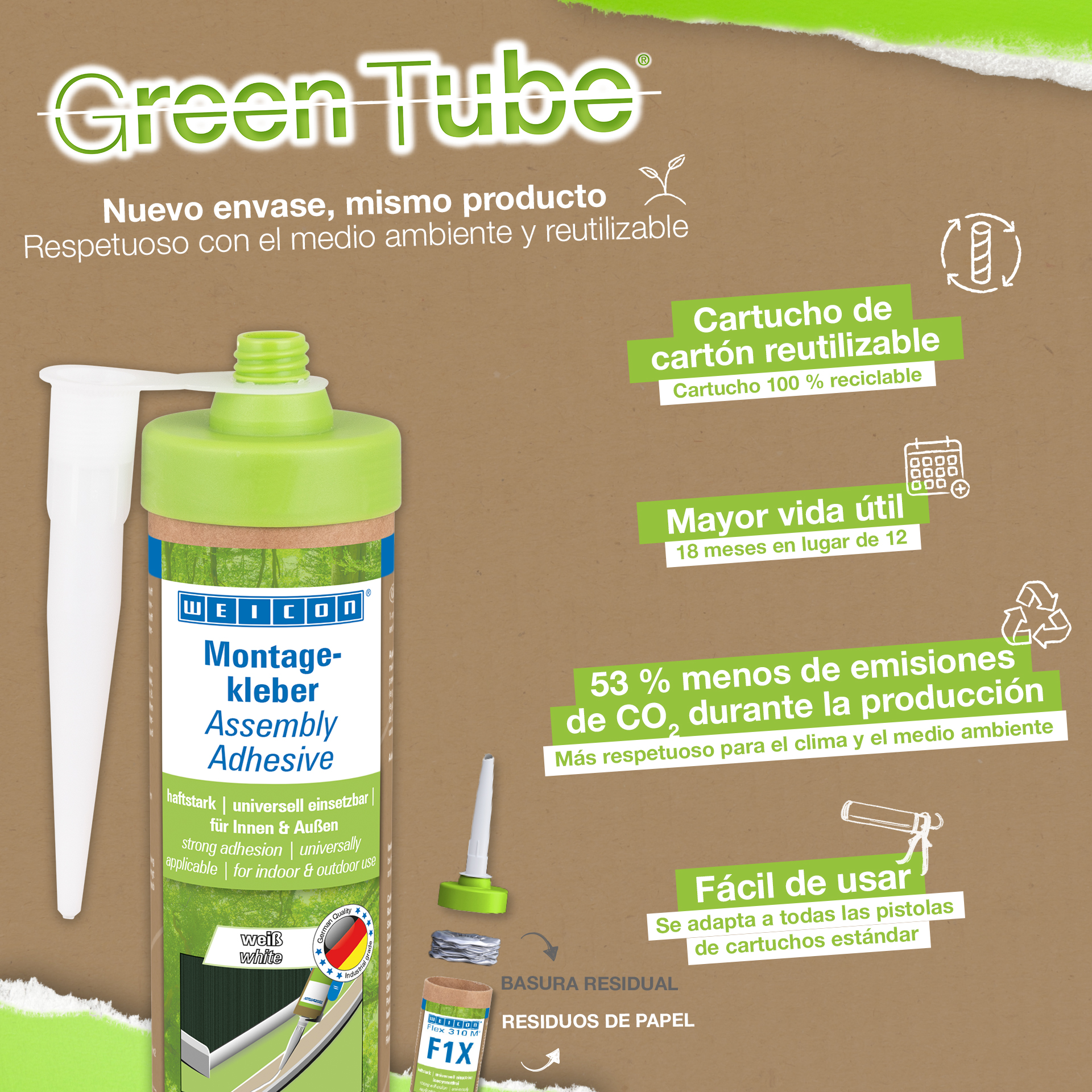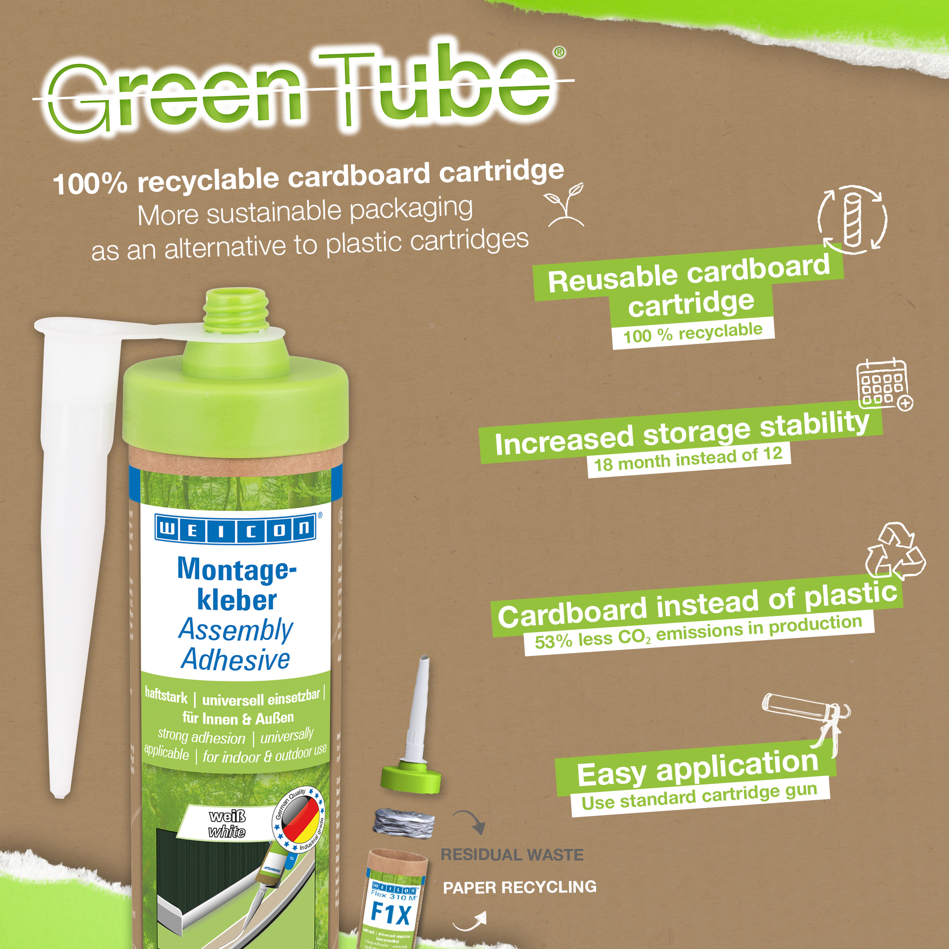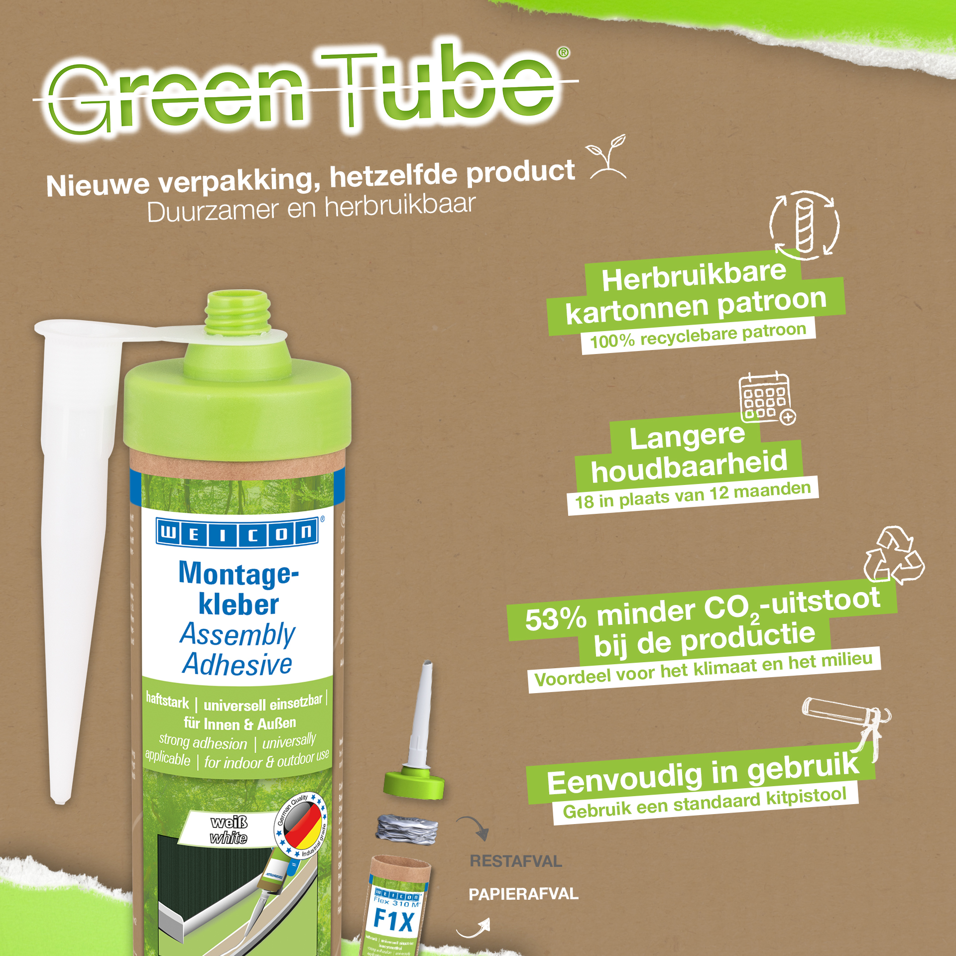 La Colle de Montage WEICON est une colle acrylique à dispersion à forte adhérence pour les travaux de montage, de réparation et de retouche. La colle dispose d'une adhérence initiale et d'une résistance finale élevées et durcit rapidement. Après séchage, la colle de montage peut être poncée et recouverte d'un enduit et peut être peinte avec des peintures et des vernis courants. La colle résiste à des températures comprises entre -20 °C et +80 °C et convient aussi bien aux applications intérieures qu'extérieures. La colle blanche flexible est à faible émission et exempte de solvants. La Colle de Montage est universelle et peut être utilisée pour les applications les plus diverses. Elle est par exemple idéale pour le collage en surface de matériaux en bois, (comme les plinthes, les moulures, les panneaux ou les panneaux de particules), le PVC, le polystyrène expansé, la mousse rigide PU (par exemple les panneaux isolants et les gaines de câbles), les matériaux minéraux (par exemple le carrelage) et les métaux sur des supports absorbants, comme le crépi, le béton, le fibrociment, le placoplâtre et le bois non traité. Emballage durable - même efficacité ! Green Tube, l'emballage durable : l'embout et le couvercle sont composés à 100 % de plastique recyclé, le corps de la cartouche à 100 % de carton. Moins d'émissions de CO2 et de consommation de plastique que les cartouches traditionnelles. Sans faire de compromis sur les performances !