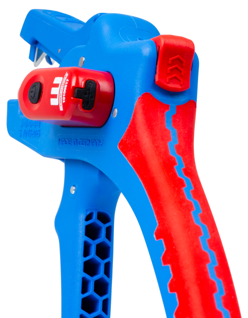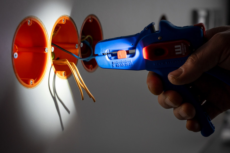 Wire Stripper No. 5 Pro: large, efficient working range from 0.2 mm² - 16 mm² | precise working due to adjustable length stop (5 - 25 mm) | integrated, easily accessible built-in side cutter up to 3 mm Ø Cu/Al |ergonomically designed anti-slip multi-component handle I LED Work Light: the integrated LED light ensures a well-illuminated working area that allows you to work safely with both hands I powerful and rechargeable lithium battery with 180 mAh I 2 hours of bright light (at level 2) after a charging time of 40 minutes I three brightness settings with up to 250 lumens, light colour: 6500K I dustproof, splash-resistant and impact-resistant housing made of polycarbonate, tested acc. to IP65 protection code I can be used with many WEICON TOOLS wire strippers
