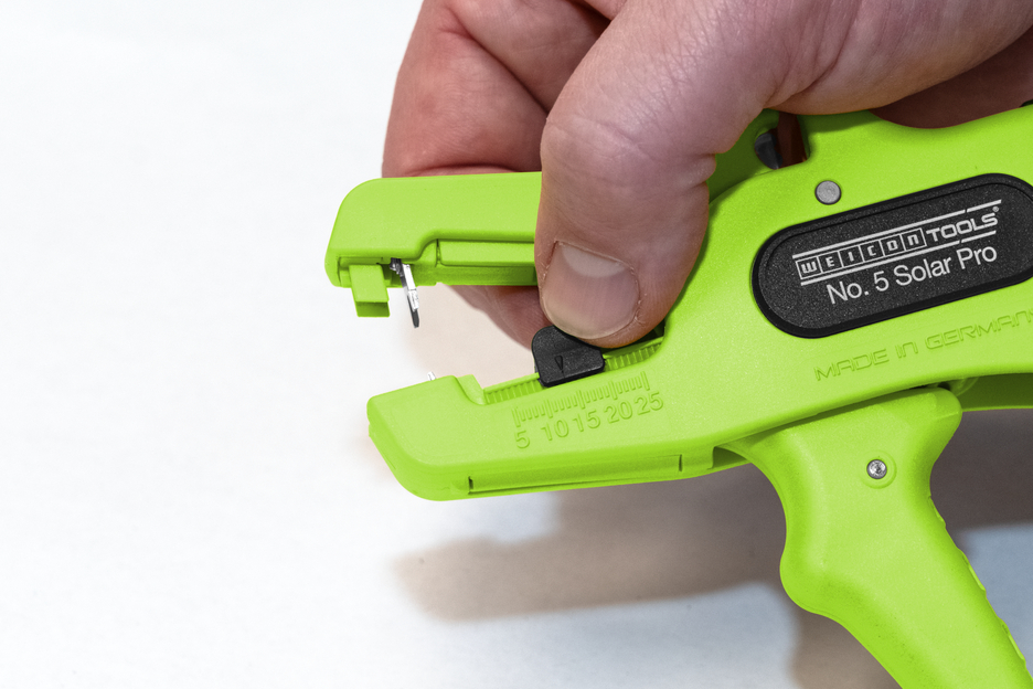 La pince automatique sert à dénuder tous les câbles solaires courants, comme par exemple H1Z2Z2-K de 1,5 à 10 mm². Grâce à une butée de longueur réglable de 5 à 25 mm, il est possible de travailler de manière très précise et exacte. Les lames de la Pince à Dénuder No. 5 Solar Pro ont été renforcées afin de pouvoir retirer sans problème les isolations caoutchoutées à plusieurs couches. La butée de réglage de la longueur peut être enlevée en cas de besoin. La pince s'adapte automatiquement à la section du conducteur - aucun réglage manuel n'est donc nécessaire. Une fonction de coup-fil a été intégré dans la pince. Elle convient aux conducteurs en cuivre et en aluminium d'un diamètre maximal de trois millimètres. Grâce à la construction compacte de l'outil, la pince peut également être utilisée dans des zones de travail difficiles d'accès, comme par exemple sur les modules solaires ou sur l'onduleur. Le mécanisme de la pince est très fluide et s'est avéré durable et fiable lors de tests. La pince dispose d'une poignée multi-composants antidérapante au design jaune et noir "Ice-Crack". La pince à dénuder est munie d'un œillet permettant d'attacher un ruban anti-chute et a été dotée d'une surface d'inscription permettant de personnaliser l'outil. De plus, la pince peut être verrouillée et rangé ainsi de manière peu encombrante. Comme pour toutes les pinces à dénuder de la ligne de produits No. 5, les lames électro-zinguées sont échangeables.