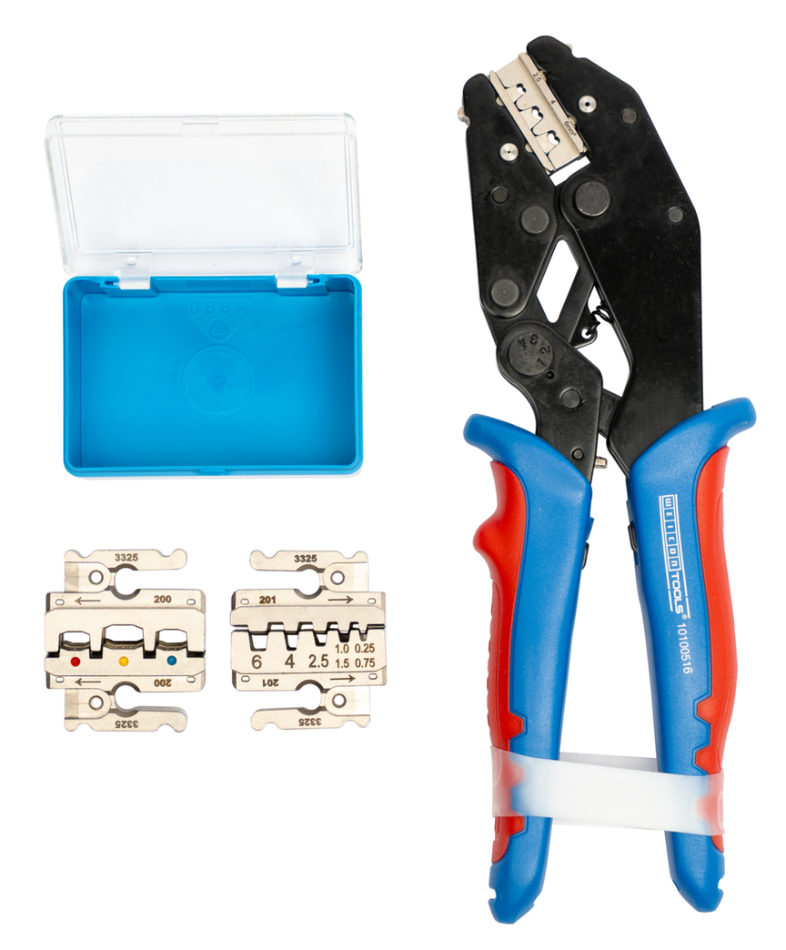 ERGO-CRIMP was developed for the process-safe crimping of various electrical connectors. The crimping tool has a ratchet mechanism with a blocking device to ensure a consistently high crimping quality and results that can be precisely repeated. The mechanism only opens the tool when the crimping process is complete. In addition, an emergency release has been integrated into the handle, which allows the user to open the crimping tool whenever necessary, e.g. in the event of misuse. Another special feature is the adjustable crimping force, which ensures a high crimping quality thanks to the precise eccentric setting. With the Multi Change System, the crimp modules can be exchanged quickly, as needed. The simple change system, which requires no additional tools, ensures that the modules can be installed and removed fast. The ERGO-CRIMP tool includes three pairs of modules made of high-quality steel. One module is suitable for MC4 connectors with cable cross-sections of 2.5 mm², 4 mm² and 6 mm² (14-10 AWG). Another pair of modules is suitable for insulated wire end ferrules from 0.25-6 mm² (AWG 24-10). The third pair of modules was developed for insulated cable lugs from 0.5-6mm² (AWG 22-10). The three pairs of modules are stored safely and protected from dust in a small plastic box. Additional module pairs are also available as accessories. The 2-component handles ensure non-slip and ergonomically friendly handling for maximum force transmission. The tried-and-tested “ice-crack design” was used, which ensures a comfortable feel. The integrated eyelets on the handles can be used to attach a safety catch.