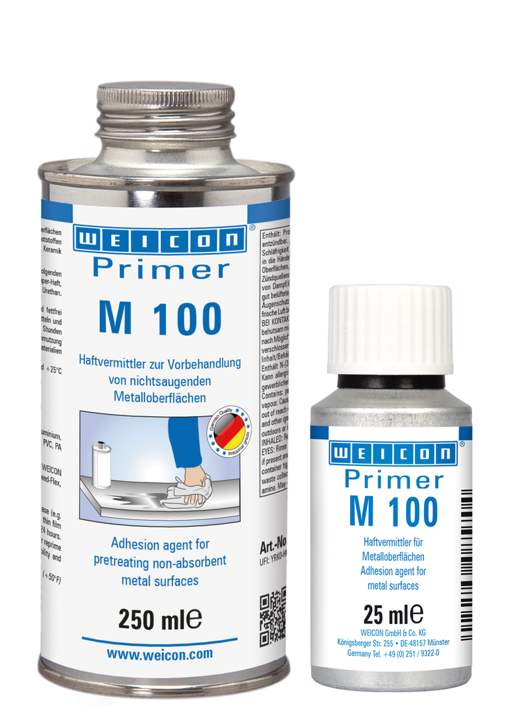 Agent d‘adhérence pour prétraiter les surfaces métalliques non absorbantes (alu, acier, acier VA, laiton, cuivre, zinc, fer-blanc), les matières plastiques (ABS, PVC dur, PA 6.6, PRFV, SMC, PUR), les surfaces peintes ou vernies, l‘émail, la céramique et le verre.