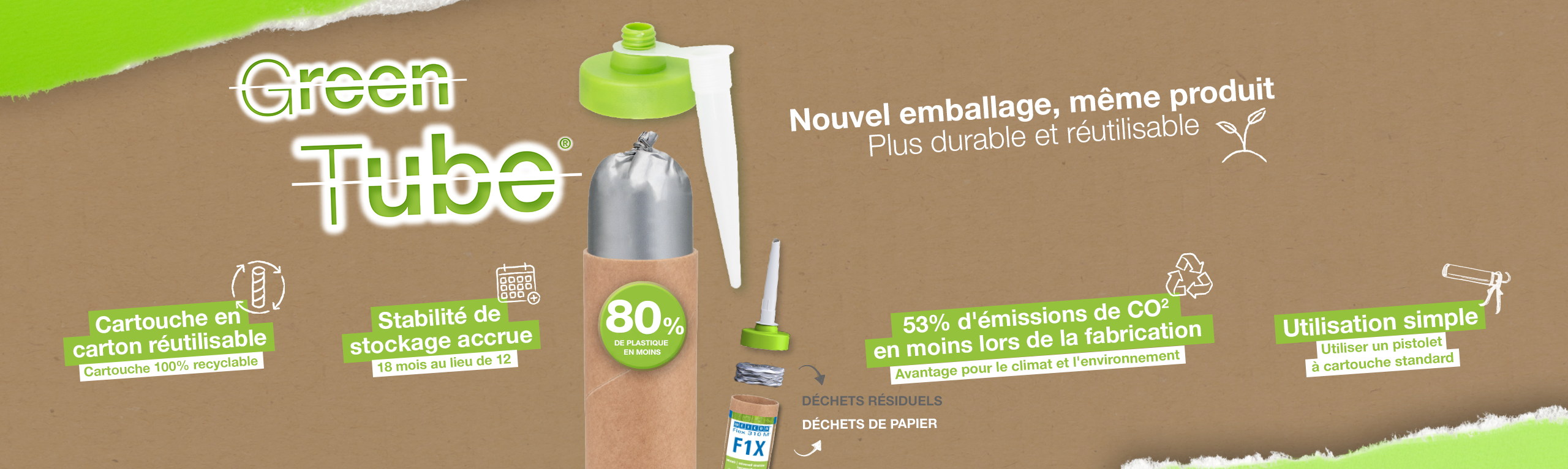 Le corps de la cartouche est réutilisable. Comme le sachet tubulaire intérieur empêche l'encrassement du manchon en carton, celui-ci peut être réutilisé. Seuls le sac tubulaire et l'embout en plastique 100 % recyclé doivent être remplacés. Cela permet également d'économiser des déchets supplémentaires.