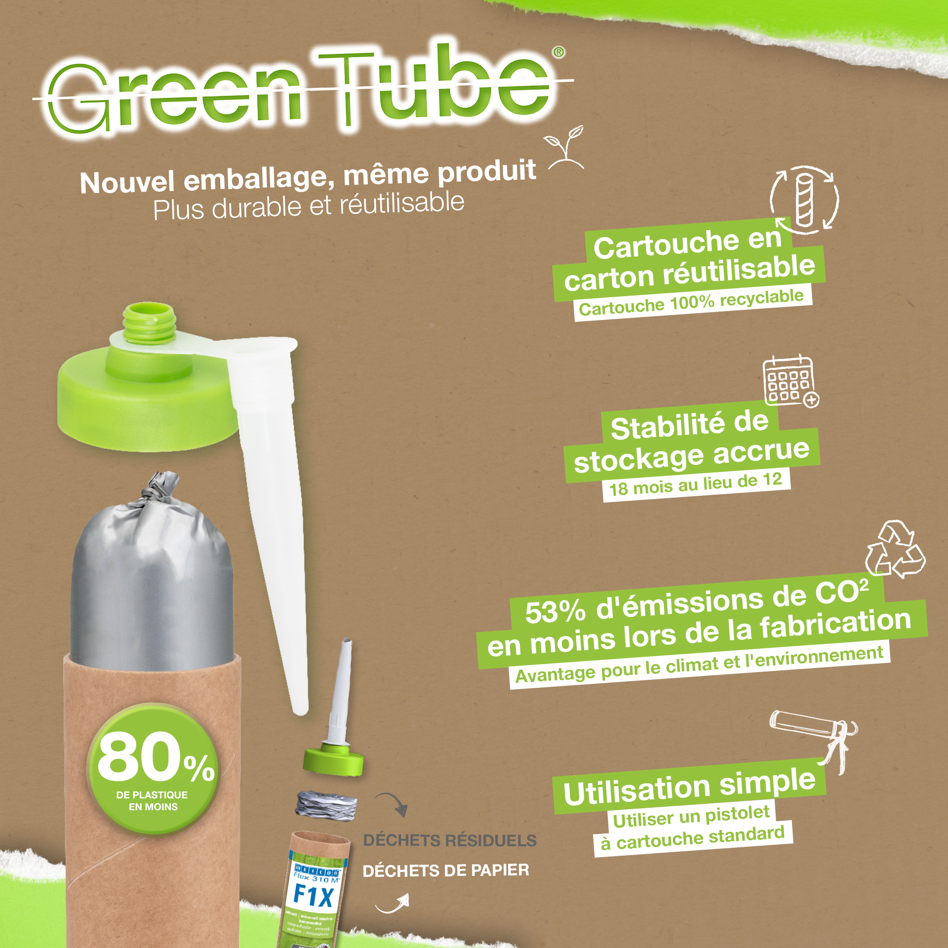 Le Green Tube s'adapte à tous les pistolets à cartouches disponibles dans le commerce et ne nécessite pas de connaissances particulières ni d'outils spéciaux tels qu'un couteau à cartouches. Il suffit de le découper sous le clip, de l'insérer, de mettre le capuchon et la pointe de dosage - et c'est parti.