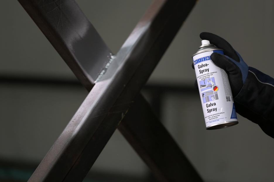 WEICON Galva Spray dient als permanente beschermende laag voor alle metaaloppervlakken. Het beschermt metalen tegen roest en corrosie, is sneldrogend en goed hechtend. De spray is zowel zoet- als zoutwaterbestendig en temperatuursbestendig tot ca. +300 °C (+572 °F). In de zoutsproeitest volgens DIN EN ISO 9227 lieten metalen onderdelen die met Galva-Spray behandeld waren, zelfs na meer dan 450 uur geen enkele corrosie zien. De spray dient voor het herstellen van verzinkte oppervlakken an gelijke tint, als hoogwaardige roestbeschermingsgrondlaag, bijvoorbeeld bij verven van carrosseriën, als coating van las- en boorplekken en als geleidende tussenlaag bij puntlassen.