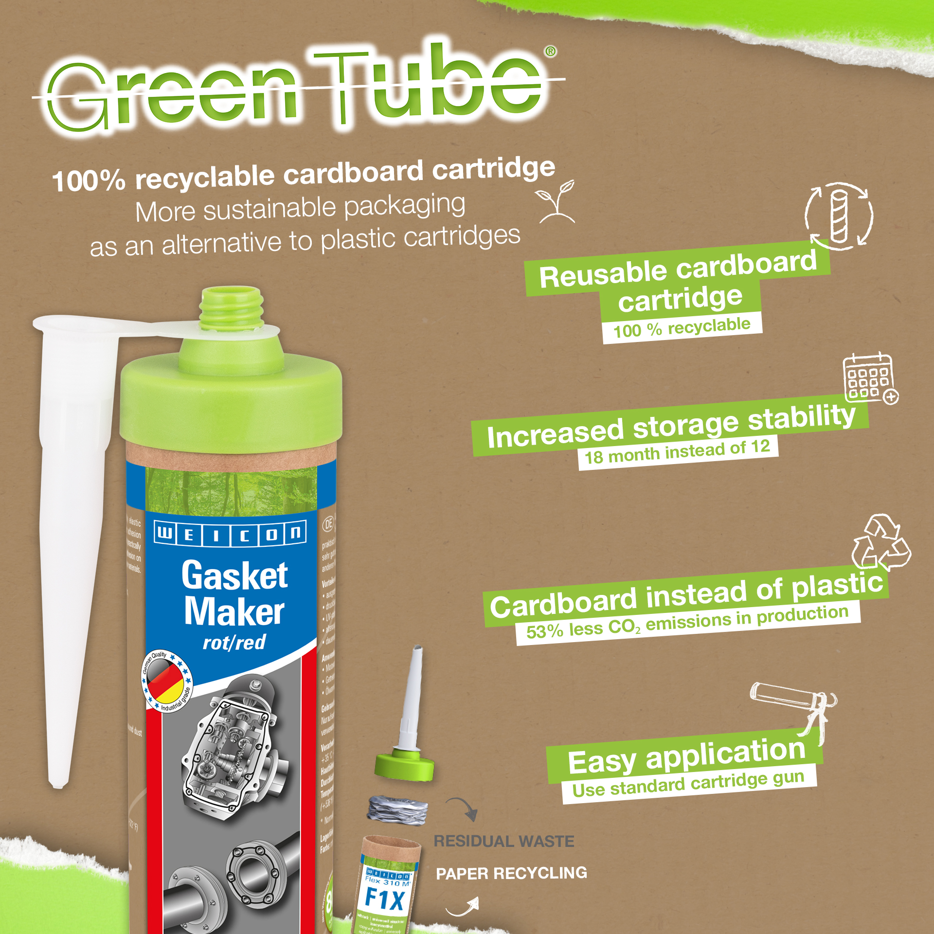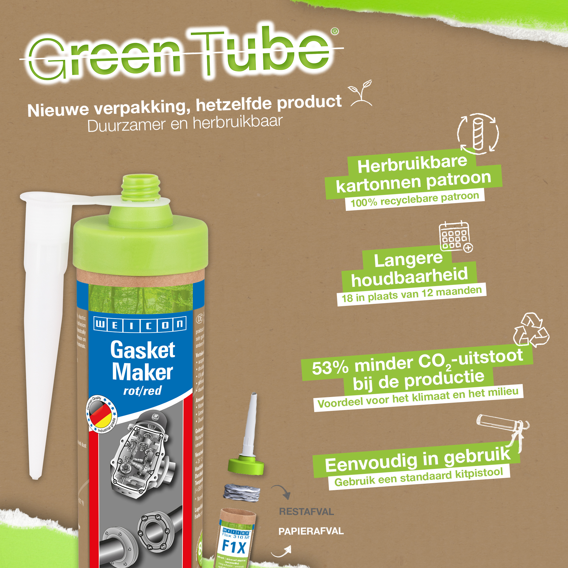 WEICON Gasket Maker is een hechtsterk, duurzaam elastisch, speciaal afdichtingsmiddel, welke door luchtvochtigheid praktisch krimpvrij uithardt. Gasket Maker hecht zeer goed op staal, aluminium, glas, keramiek en vele andere materialen. Gasket Maker beschikt over een uitstekende temperatuurs-, olie- en vetbestendigheid, is drukbestendig, Uv-bestendig, verouderingsbestendig en duurzaam elastisch. Het speciale afdichtingsmiddel kan op motoren en waterpompen, tandwielen en assen, oliecarters enz. gebruikt worden.