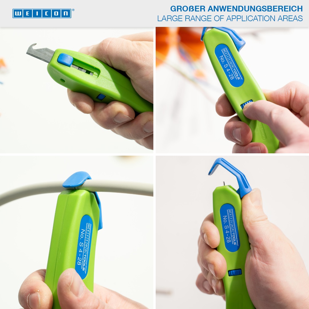 Met de Green Line is een zeer speciale serie gereedschap ontwikkeld. De gereedschappen zijn gemaakt van tot 97% hernieuwbare grondstoffen, zijn recyclebaar en hebben een uitstekende milieubalans. Met de 4-28 H kabelschaar kunnen alle standaard ronde kabels met een diameter tussen 4 en 28 millimeter nauwkeurig, snel en veilig worden gestript. De kabelschaar heeft een ergonomisch gevormde, anti-slip handgreep. De snijdiepte van het snijmes kan traploos worden ingesteld met een stelschroef aan het uiteinde van de handgreep. Dit voorkomt beschadiging van de binnengeleider. Het snijmes is zelfdraaiend in de behuizing geïntegreerd, waardoor automatisch van cirkelvormig naar lengtesnijden kan worden overgeschakeld. De 4-28 H heeft ook een gehaakt mes dat kan worden voorzien van een beschermkap. Deze beschermkap klikt stevig vast op het mes, waardoor het risico op letsel aanzienlijk wordt verkleind.