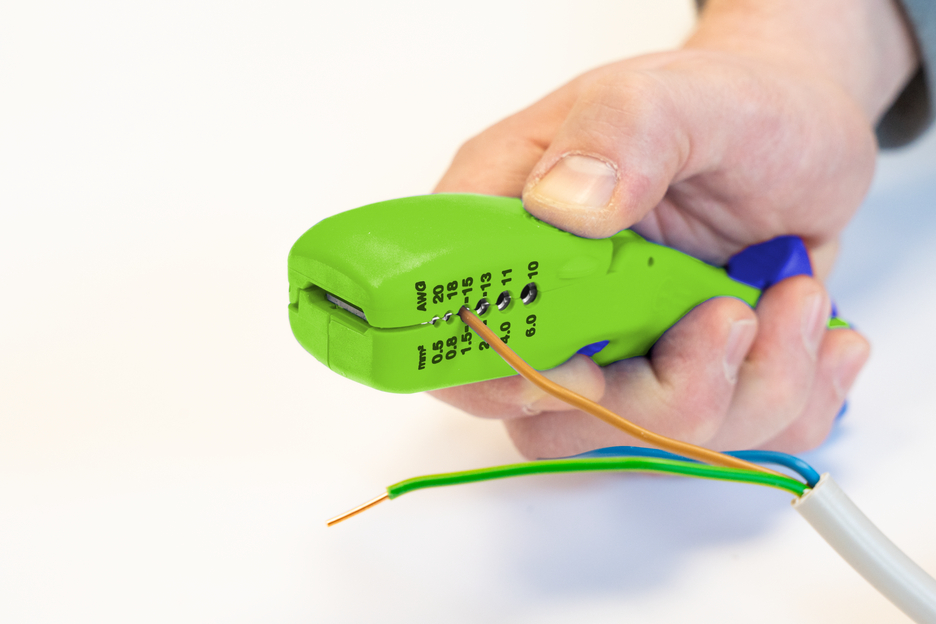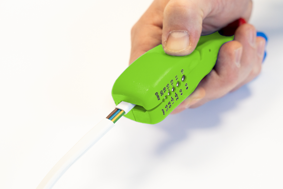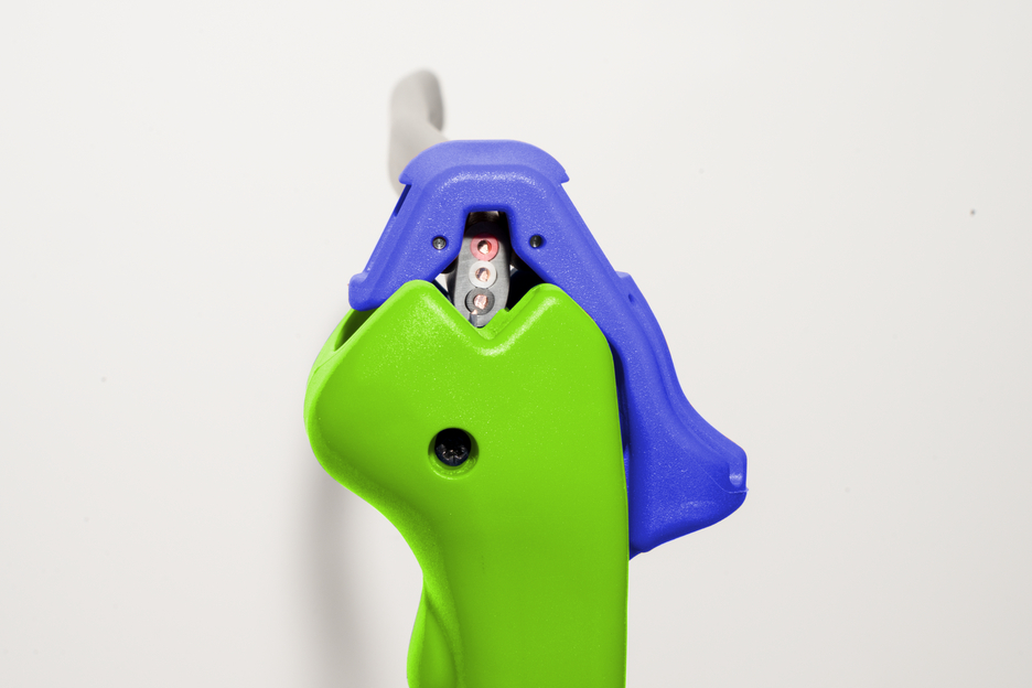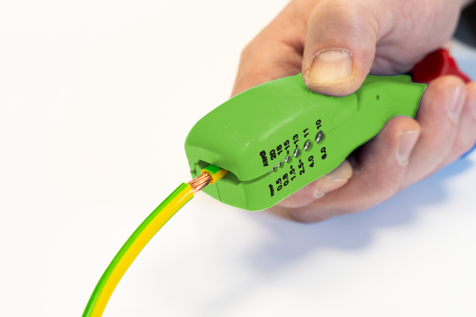 Met het 4-in-1 kabelmes F&R Green Line kunnen alle gangbare platte en ronde kabels snel, nauwkeurig en veilig worden gestript. Het gereedschap is ontworpen voor platte kabels met een breedte tot 18 mm en voor ronde kabels met een diameter tot 13 mm. Door de kabeldoorvoer aan de kop van het gereedschap zijn lengtesneden – vooral bij langere afstanden – zeer eenvoudig uit te voeren. De lengtesneden kunnen zowel bij platte als bij ronde kabels worden uitgevoerd. Onder de kabeleindgeleider bevindt zich een draaibaar binnenmes. Met dit mes kunnen, net als bij alle WEICON TOOLS kabelmessen, in één werkgang zowel ronde als lengtesneden worden uitgevoerd op ronde kabels (van 6 tot 13 mm). Met een vergrendelbaar instelwiel kan de diepte van het mes comfortabel en nauwkeurig worden ingesteld in stappen van 0,1 mm tot 3 mm. Hierdoor wordt schade aan dieper gelegen lagen voorkomen. Aan de voet van het handzame gereedschap zijn nog twee messen ingebouwd. Deze dienen voor het parallel insnijden van de buitenmantel resp. de isolatie. Zo kan de buitenmantel ook in zeer krappe ruimtes, zoals bijvoorbeeld in aftakdozen of kabelgoten, gemakkelijk worden verwijderd. Door de speciale constructie van het gereedschap kunnen zowel aan de kop- als aan de voetzijde langere stukken worden gestript. Platte kabels met een breedte tot 18 mm en ronde kabels met een diameter tot 13 mm kunnen probleemloos door het gereedschap worden gevoerd. Aan de onderkant van de gereedschapbehuizing is een extra stripfunctie aangebracht. Hiermee kunnen alle gangbare flexibele en massieve geleiders met een doorsnede tussen 0,5 en 6 vierkante millimeter worden gestript.