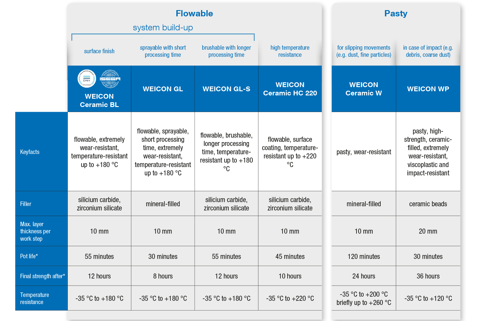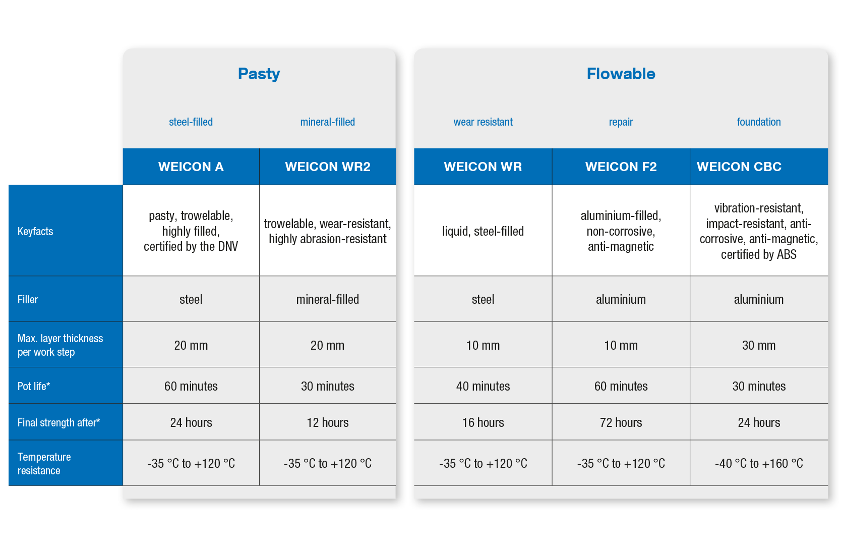 WEICON biedt een hele reeks producten die als gietmassa, voor opvulling en voor spleetcompensatie kunnen worden ingezet. Ze vinden ook hun weg bij de productie van prototypes of bevestigingsmiddelen. De speciaalproducten kunnen ook worden toegepast voor de reparatie van transportsystemen, glijbanen of geleiderails. De epoxyharsen bieden uitkomst in de staalbouw, het spoor, kraaninstallaties en bij de brugreparatie. De voordelen van deze reparatiesystemen zijn een hoge vloeibaarheid, een hoge adhesie en een zeer goede drukbestendigheid. Bovendien bieden ze langdurige corrosiebescherming.