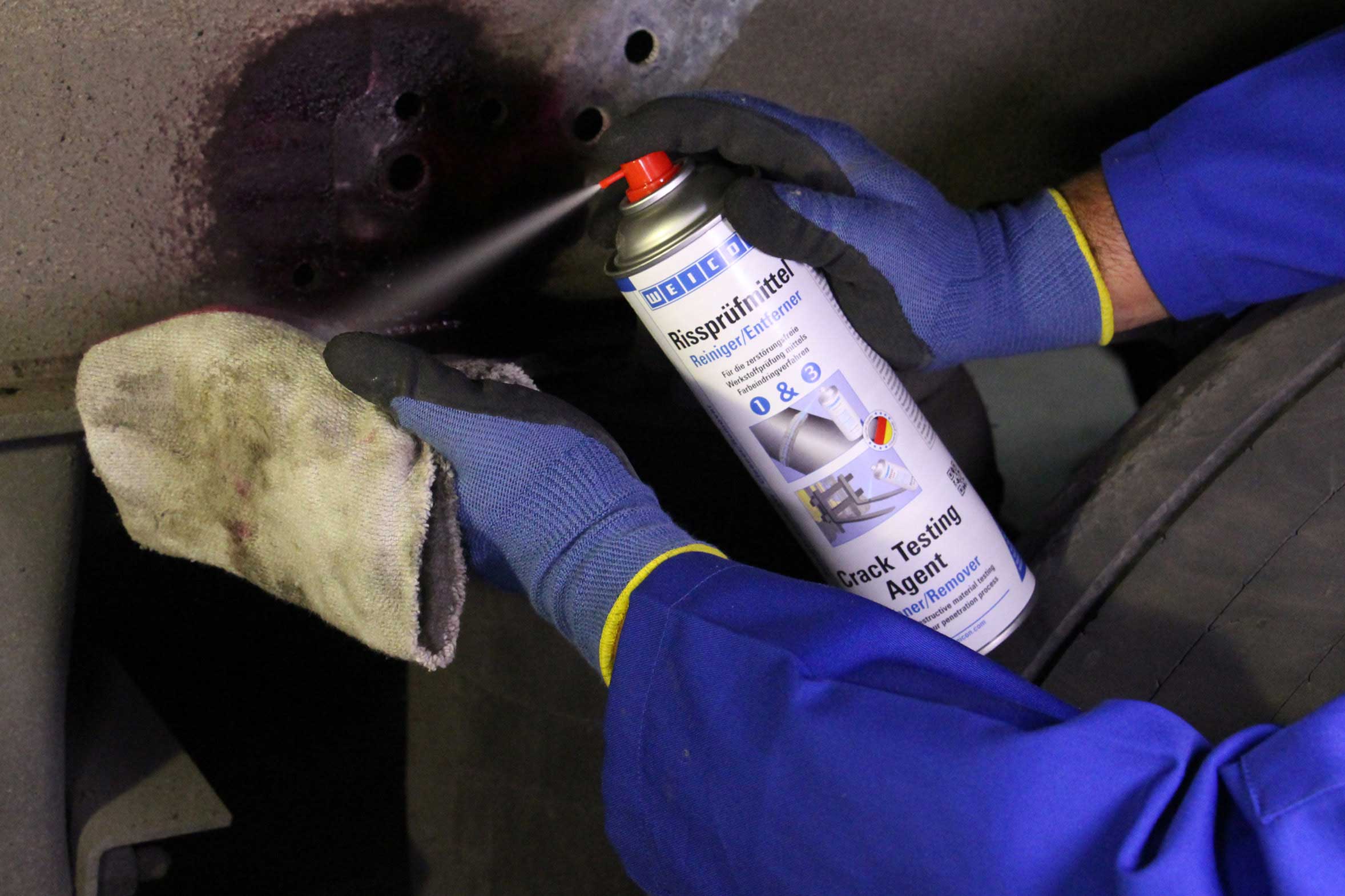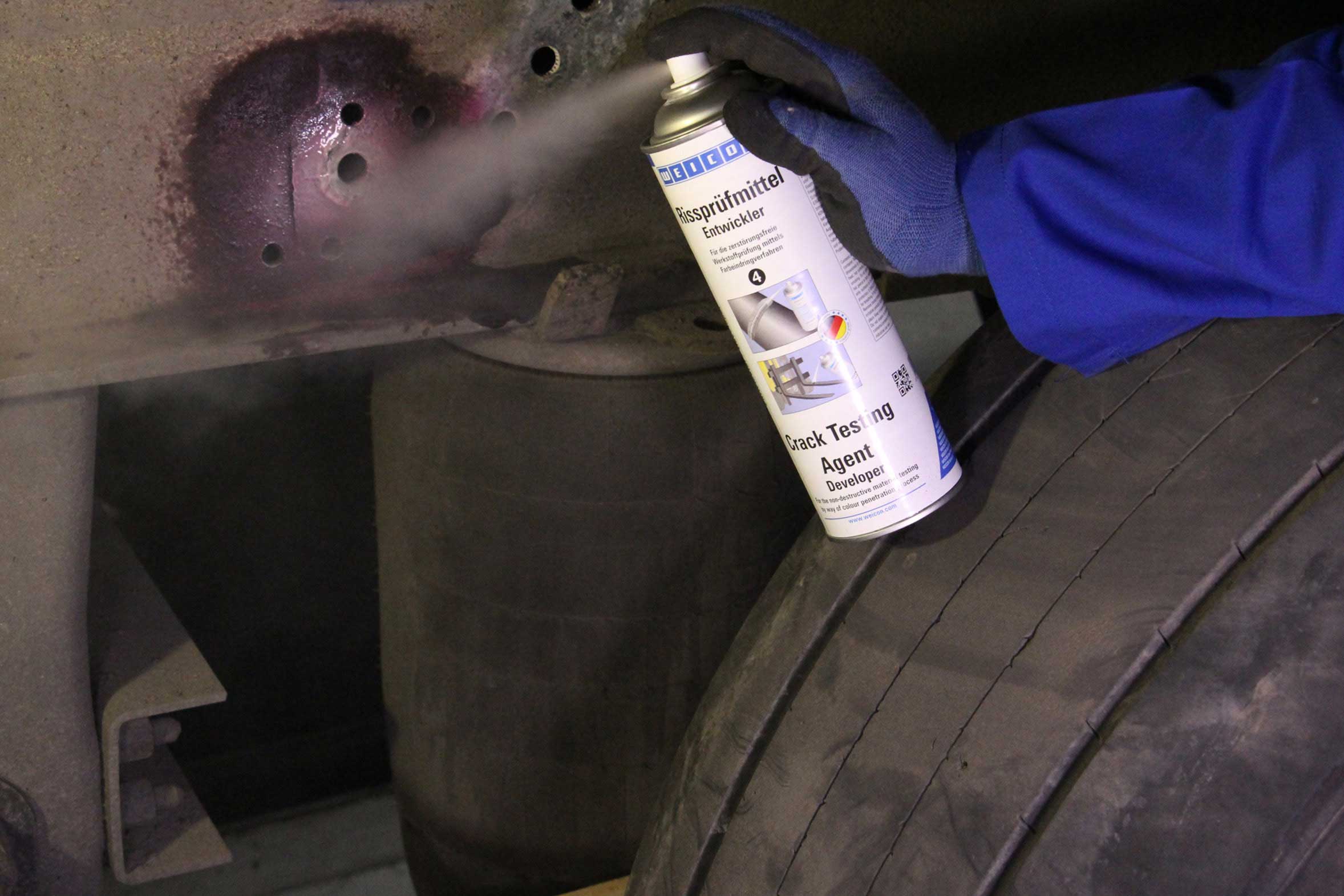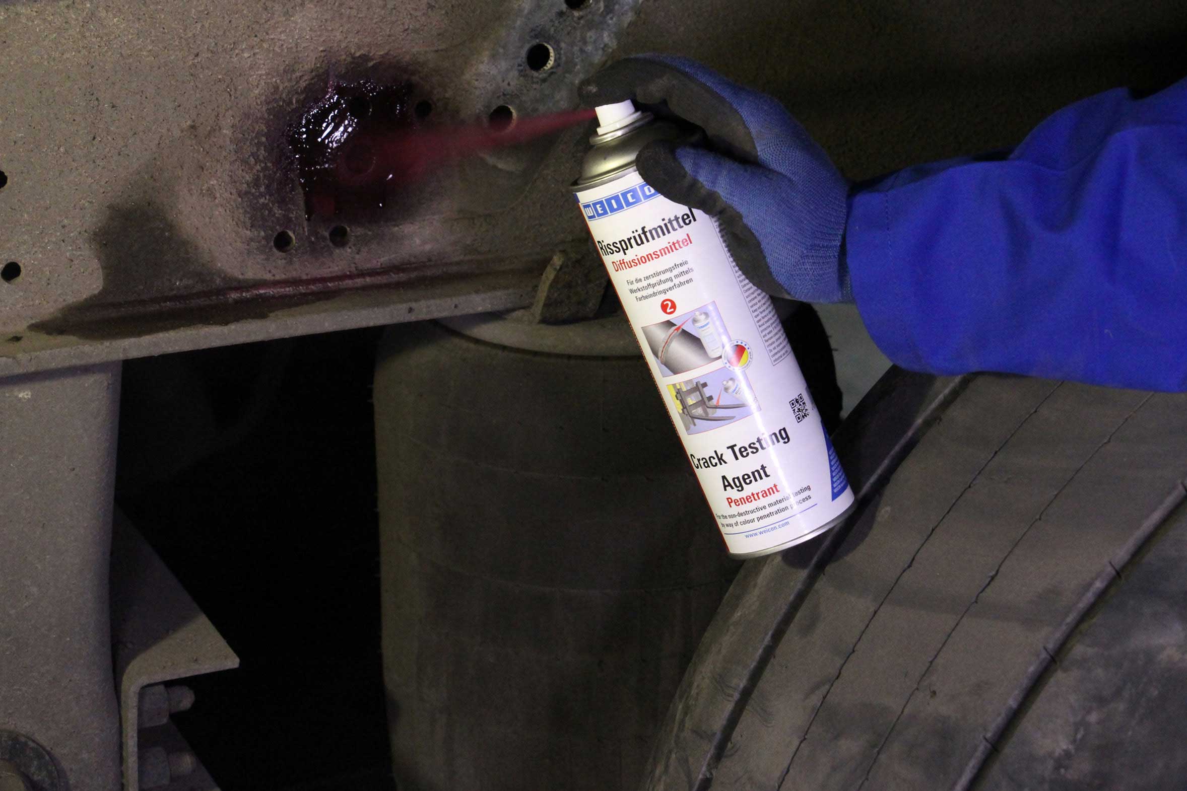 Deze onderhoudsmaatregelen dienen om de operationele processen en de gezondheid en veiligheid op het werk te optimaliseren. De kleurpenetratietest is een gevestigde materiaaltestmethode voor het vroegtijdig opsporen en elimineren van scheuren en kleine lekken. WEICON Scheurtestmiddel is een testsysteem, bestaande uit 3 speciale sprays, waar het kleurpenetratieproces eenvoudig en ongecompliceerd uitgevoerd kan worden - hier bijvoorbeeld aan een vrachtauto.