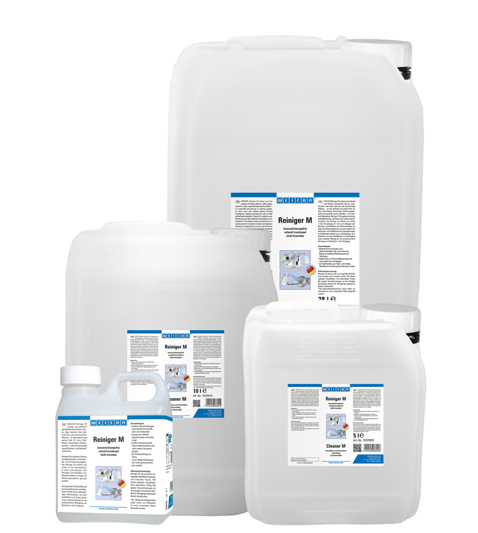 WEICON Reiniger M reinigt en ontvet alle metalen, kunststoffen rubber, glas, keramiek, hout of geverfte en gecoate oppervlakken. Het lost krachtig en specifiek vet, olie, hars, roet, was, anti-hechtmiddelen, vormmiddelen, koelsmeermiddelen, alsook etiket- en lijmresten op. Reiniger M is gebruiksklaar, sneldrogend, niet brandbaar en veiligheidspictogram vrij. De reiniger is eenvoudig en veilig toepasbaar. Het kan bijvoorbeeld gebruikt worden voor het reinigen en ontvetten van machine-onderdelen en gereedschappen. De bijzondere formule uit speciaaltensiden en alcoholen bevat geen silicoonhoudende anti-schuimmiddelen, is niet terugvettend en biedt daardoor zekere, veilige bijdrage aan de proceszekere reiniging van onderdelen in de productie.