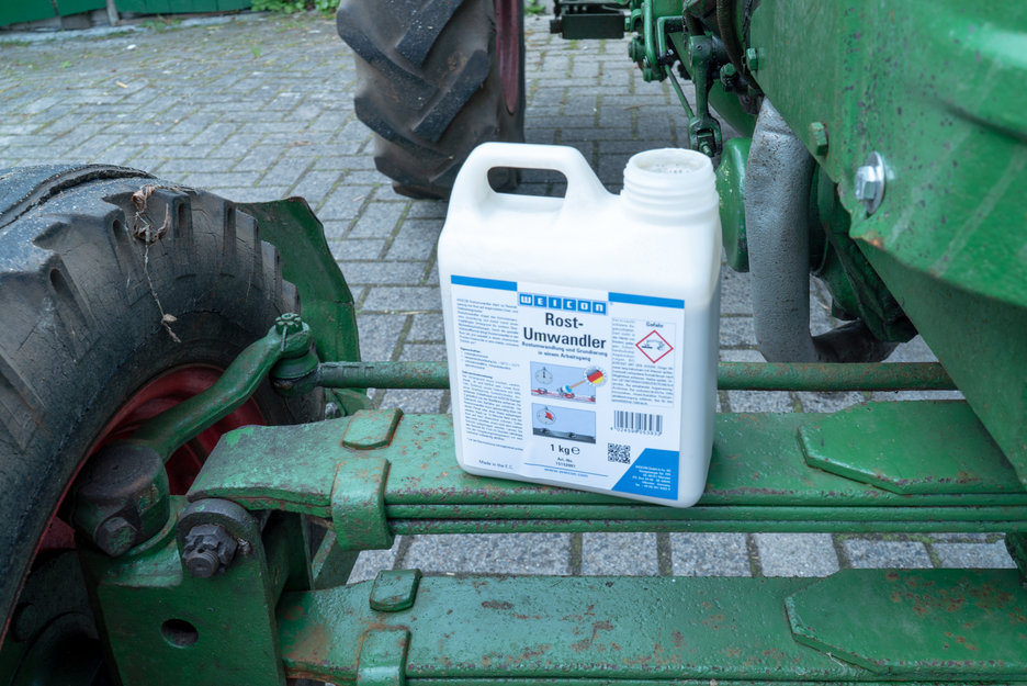 WEICON Roestomvormer wordt gebruikt om roest te neutraliseren op geroeste ijzeren en stalen ondergronden en beëindigt op betrouwbare wijze het corrosieproces. De roestomvormer dringt door in de roest dankzij de speciale formule van zuur en looistof. Het zet in een chemisch proces ijzeroxiden om in een stabiele laag en laat bovendien een tijdelijke corrosiebescherming achter door middel van zinkfosfaat. Afhankelijk van het koolstofgehalte van het metaal verandert het behandelde oppervlak van kleur, van blauwachtig naar bruinachtig tot zwart. De laag vormt de ideale basis voor latere beschermende coatings, zoals WEICON Zinkspray. WEICON Roestomvormer bereikt optimale resultaten op licht geroeste oppervlakken met een roestgraad A en B. Losse roest en losse onderdelen moeten eerst mechanisch verwijderd worden. De converter wordt pas actief wanneer deze aangebracht wordt op roest of metaal en kan over grote oppervlakken gebruikt worden op alle roestplekken, bijvoorbeeld op machines en apparatuur, landbouwmachines en motorvoertuigen. In tegenstelling tot andere omvormers wordt WEICON Roestomvormer na afloop van de reactietijd met helder water en een spons of zachte borstel van het behandelde oppervlak verwijderd. Zo worden restmaterialen verwijderd, die als gevolg van het transformatieproces ontstaan.