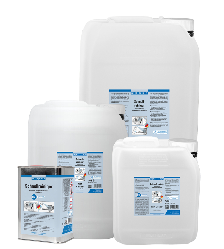 De Snelreiniger beschikt over NSFgoedkeuring voor de levensmiddelensector en kan daarom als reiniger en ontvetter voor het verwijderen van vuil in het kader van onderhoudswerkzaamheden alsook voor het verwijderen van lijmen in de levensmiddelenindustrie, in de voedingsmiddelen- en drankenindustrie en in de farmaceutische en cosmetische industrie worden gebruikt. WEICON Snelreiniger wordt gebruikt voor het reinigen en ontvetten van oppervlakken die met WEICON lijm- en afdichtingsmiddelen verlijmt of afgedicht gaan worden. Snelreiniger is pH-neutraal en daardoor materiaal-vriendelijk en kan op veel materialen worden gebruikt zoals metalen, glas, keramiek en de meeste rubber en kunststoffen. Door de speciale receptuur en de daaruit resulterende NSF goedkeuring, draagt Snelreiniger bij aan de verbetering van de veiligheid op de werkplek en de gezondheidsbescherming.