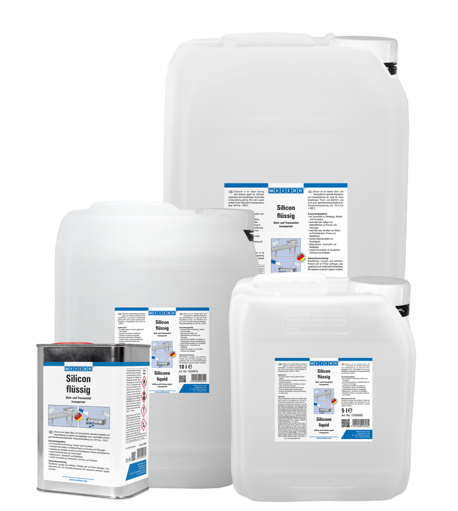 WEICON Siliconen is een smeer- en scheidingsmiddel alsmede een beschermings- en onderhoudsmiddel voor kunststof, rubber en metaal. WEICON Siliconen zorgt voor een langdurige scheidingsfilm en een goede oppervlaktebehandeling. Het voorkomt de opbouw van lijmresten aan persen en geleiders, het plakken van waren aan banden, goten of rolbanen. WEICON Siliconen beschermt elektrische contacten tegen vocht, verzorgt rubber, kunststof en metaaloppervlakken, beschermt rubber tegen verharding, bevriezing en aanhechting en bevordert het soepel lopen van schuifdaken, stoelrails en rolautomaten van veiligheidsgordels.