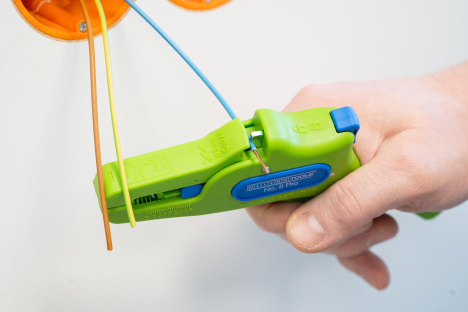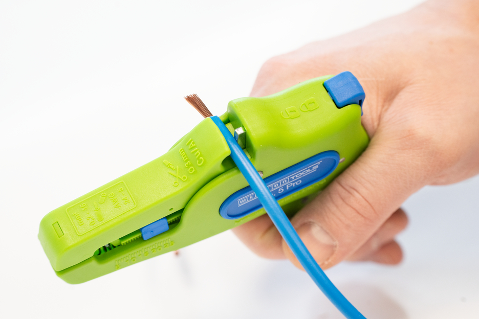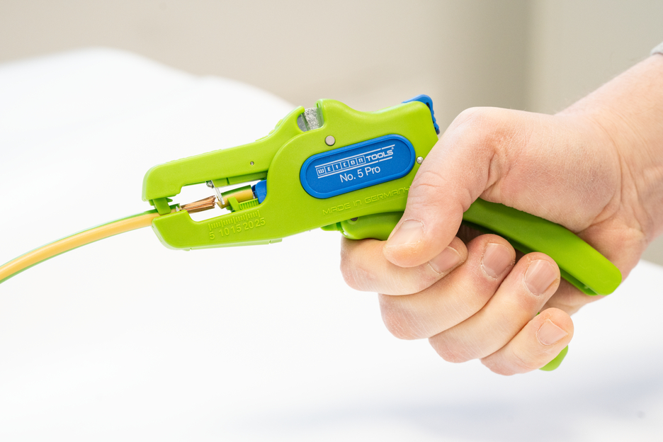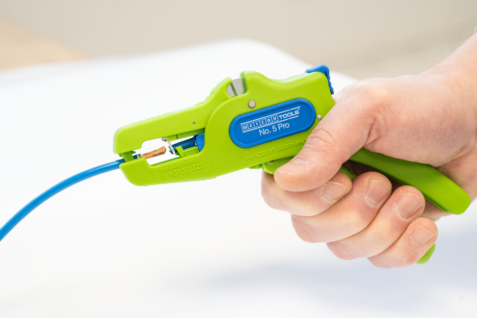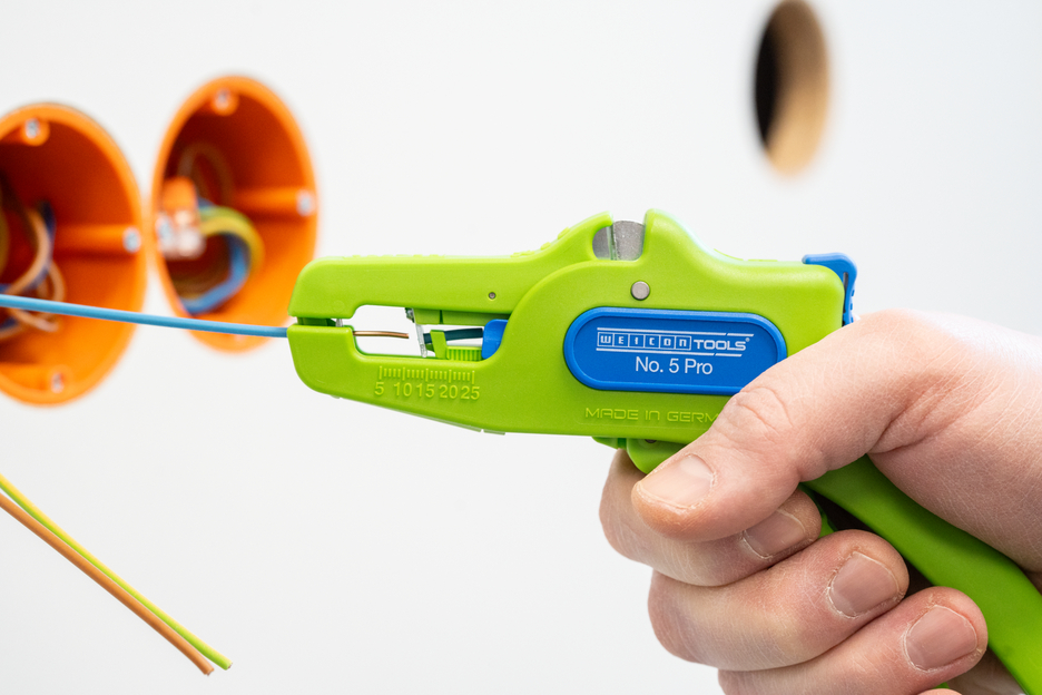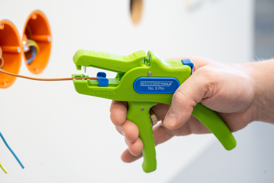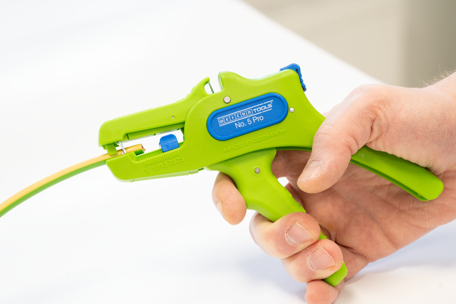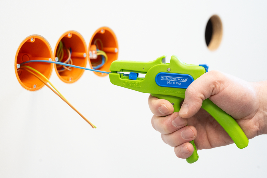 De automatische tang dient voor het strippen van alle gangbare flexibele en massieve geleiders van 0,2 tot 16 mm². Dankzij een verstelbare lengte-aanslag van 5 tot 25 mm kan zeer nauwkeurig en precies worden gewerkt. De lengte-aanslag kan indien nodig ook worden verwijderd. De tang past zich automatisch aan de betreffende geleiderdoorsnede aan, waardoor handmatige instelling niet nodig is. In de tang is een zijkniptang geïntegreerd die geschikt is voor koperen en aluminium geleiders met een diameter tot drie millimeter. Door het slanke ontwerp van het gereedschap kan de tang ook worden gebruikt in moeilijk toegankelijke werkruimtes, zoals schakelkasten. De mechanica van de tang werkt zeer soepel en heeft zich in tests bewezen als duurzaam en betrouwbaar. De tang heeft een antislip handgreep van meerdere componenten in een blauw-rood “Ice-Crack”-ontwerp. Door de ergonomische vorm van de handgreep ligt het gereedschap goed in de hand en kunt u zonder vermoeidheid werken. Bovendien kan de tang worden vergrendeld, waardoor hij ruimtebesparend kan worden opgeborgen. De striptang heeft een oogje waaraan een band kan worden bevestigd om te voorkomen dat hij valt, en is voorzien van een labelveld om het gereedschap te kunnen personaliseren.