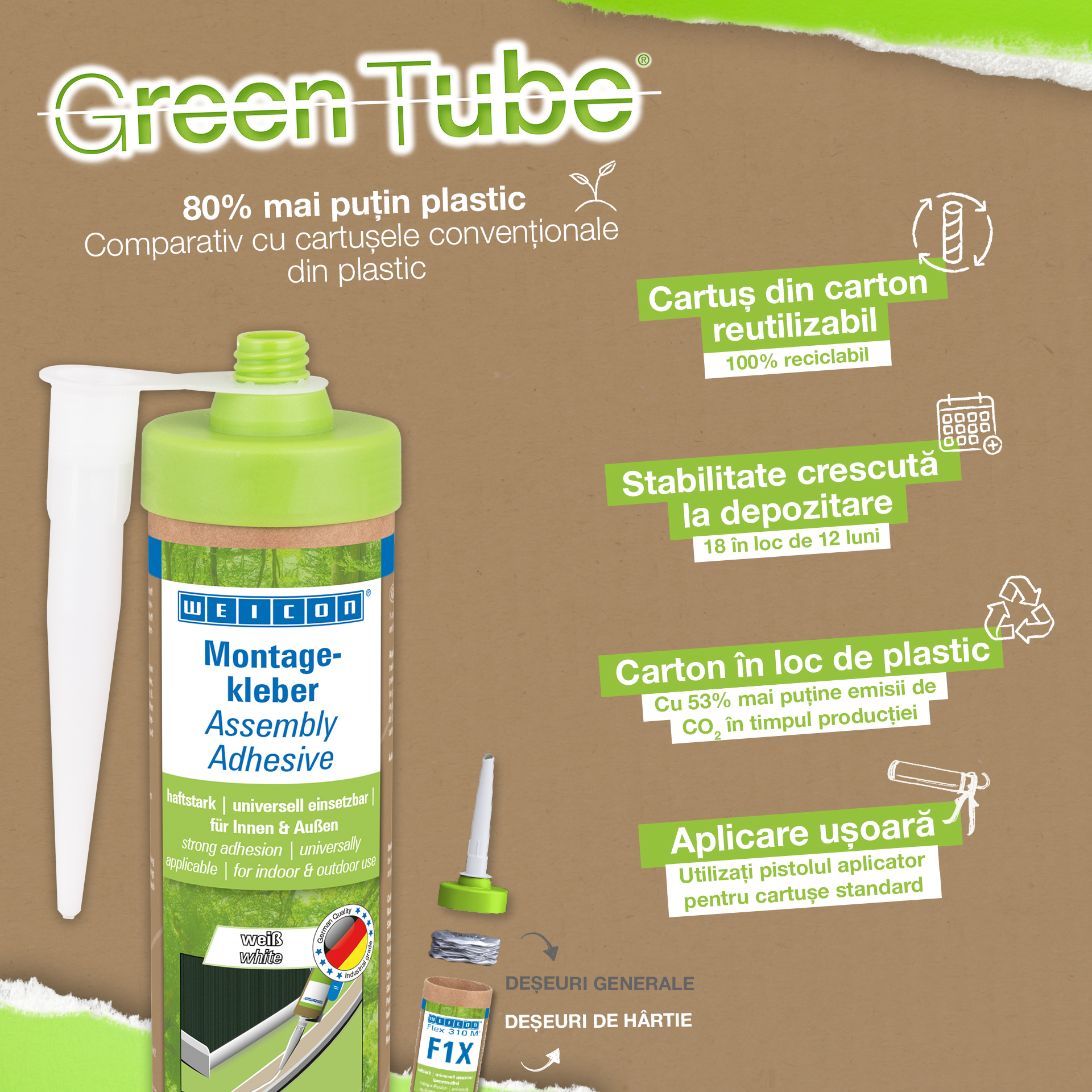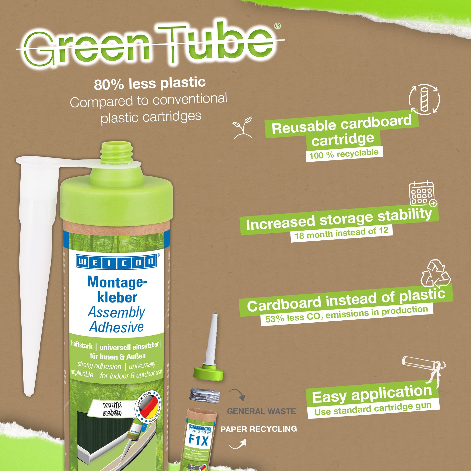 WEICON Montagelijm is een sterke dispersielijm op basis van acryl voor montage-, reparatie- en verbeteringswerkzaamheden. De lijm heeft een hoge aanvangshechting en eindsterkte en hardt snel uit. Na het drogen kan de montagelijm geschuurd en bepleisterd worden en kan hij overschilderd worden met in de handel verkrijgbare verven en vernissen. De lijm is temperatuurbestendig in een bereik van -20 °C tot +80 °C en is geschikt voor zowel binnen- als buitentoepassingen. De witte flexibele lijm is emissiearm en bevat geen oplosmiddelen. De montagelijm is universeel toepasbaar en kan voor veel verschillende toepassingen gebruikt worden. Het is bijvoorbeeld ideaal voor oppervlakteverlijming van materialen op houtbasis (zoals plinten, decoratieve strips, panelen of spaanplaat), PVC, polystyreen, polystyreenschuimplaten, PU-hardschuim (bijv. isolatieplaten en kabelgoten), minerale materialen (bijv. tegels) en metalen op zuigende ondergronden zoals pleisterwerk, beton, vezelcement, gipsplaat en onbehandeld hout. Duurzaam verpakt – En even sterk! Green Tube, de duurzame verpakking: de punt en het deksel bestaan 100% uit gerecycleerd kunststof, de patroon is 100 % volledig gemaakt uit karton. Minder CO2-uitstoot en plastic verbruik in vergelijking met conventionele patronen. Zonder enig voorbehoud op het gebied van prestaties!