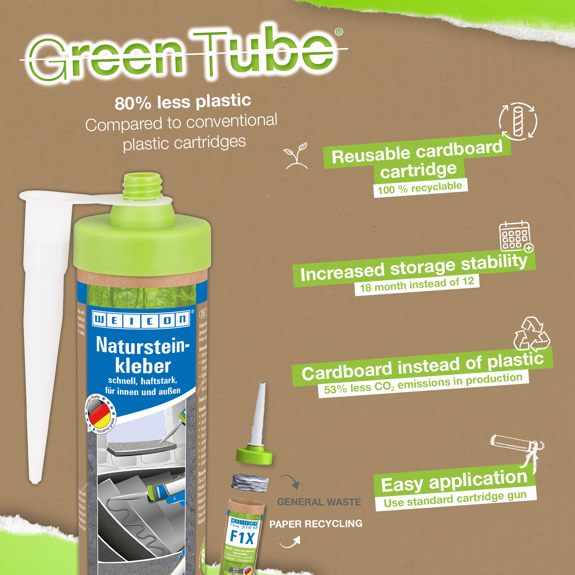 WEICON Natuursteenlijm is een sterke lijm voor de installatie van natuursteen, steen en keramiek. Dankzij de zeer hoge eerste hechting en snelle opbouw van de kleefkracht is verlijming zelfs mogelijk op verticale oppervlakken zoals muren. De steenlijm is geschikt voor vele binnen- en buitentoepassingen. Het is vorstbestendig, heeft een hoge temperatuurbestendigheid van -40 °C tot +90 °C en een hoge weer- en UV-bestendigheid. De natuursteenlijm hardt snel uit en heeft een zeer hoge eindsterkte. Na uitharding kan de lijm worden geschuurd en blijft elastisch om beweging te compenseren. De steenlijm is siliconenvrij, isocyanaatvrij, halogeenvrij en oplosmiddelvrij. Het kan worden gebruikt in een breed scala aan toepassingen - voor het verlijmen van vensterbanken, tegels, plinten, sierlijsten of traptreden. WEICON Natuursteenlijm hecht zeer goed op een grote verscheidenheid aan materialen, zoals hout, materialen op houtbasis, kunststoffen, metalen, glas en minerale ondergronden. Hij is verkrijgbaar in grijs en wit.